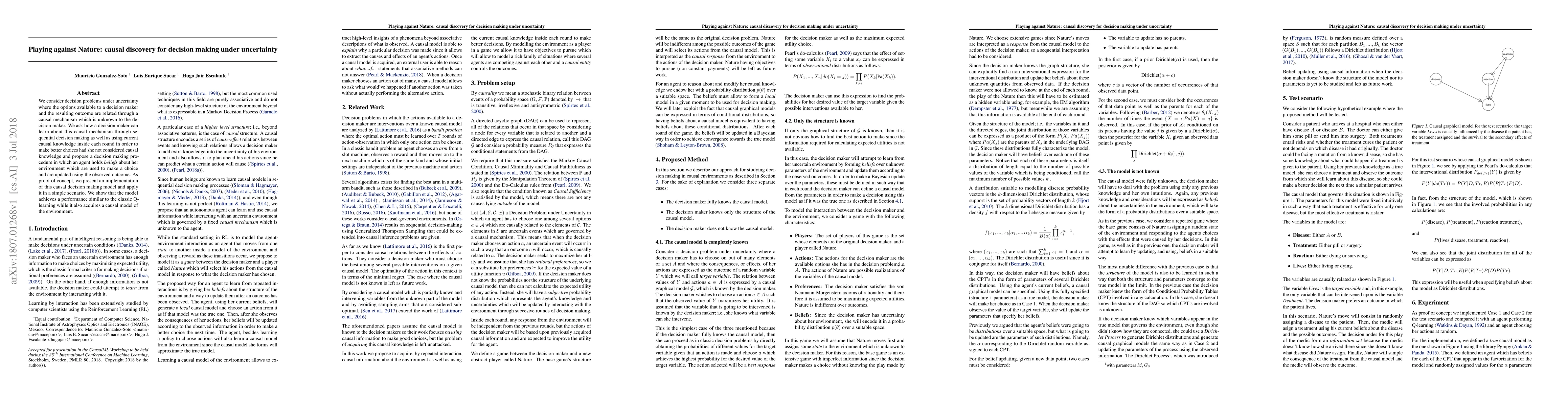 This paper proposes a decision-making procedure for uncertain environments where the causal mechanism is unknown, utilizing sequential decision making and updating beliefs based on observed outcomes. The model demonstrates comparable performance to classic Q-learning while also learning a causal model of the environment.