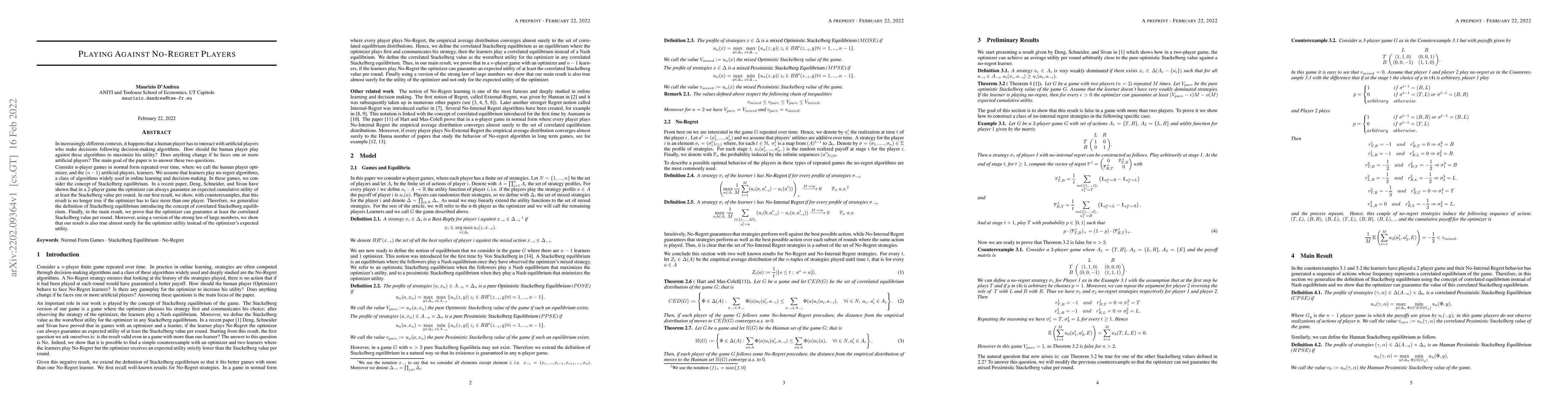 In increasingly different contexts, it happens that a human player has to interact with artificial players who make decisions following decision-making algorithms. How should the human player play against these algorithms to maximize his utility? Does anything change if he faces one or more artificial players? The main goal of the paper is to answer these two questions. Consider n-player games in normal form repeated over time, where we call the human player optimizer, and the (n -- 1) artificial players, learners. We assume that learners play no-regret algorithms, a class of algorithms widely used in online learning and decision-making. In these games, we consider the concept of Stackelberg equilibrium. In a recent paper, Deng, Schneider, and Sivan have shown that in a 2-player game the optimizer can always guarantee an expected cumulative utility of at least the Stackelberg value per round. In our first result, we show, with counterexamples, that this result is no longer true if the optimizer has to face more than one player. Therefore, we generalize the definition of Stackelberg equilibrium introducing the concept of correlated Stackelberg equilibrium. Finally, in the main result, we prove that the optimizer can guarantee at least the correlated Stackelberg value per round. Moreover, using a version of the strong law of large numbers, we show that our result is also true almost surely for the optimizer utility instead of the optimizer's expected utility.