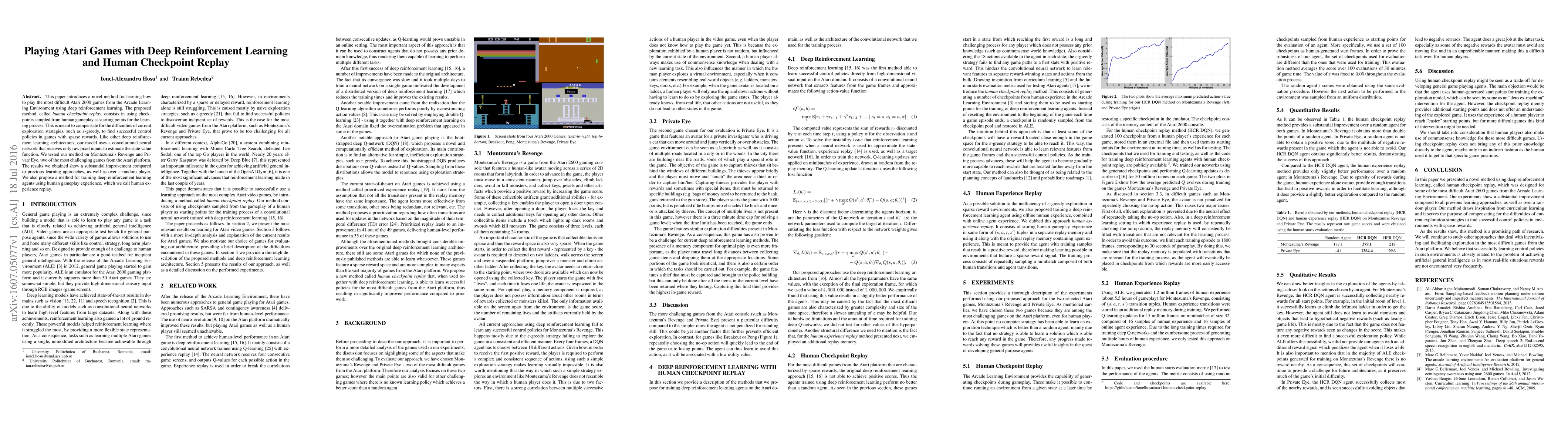 This paper introduces a novel method for learning how to play the most difficult Atari 2600 games from the Arcade Learning Environment using deep reinforcement learning. The proposed method, human checkpoint replay, consists in using checkpoints sampled from human gameplay as starting points for the learning process. This is meant to compensate for the difficulties of current exploration strategies, such as epsilon-greedy, to find successful control policies in games with sparse rewards. Like other deep reinforcement learning architectures, our model uses a convolutional neural network that receives only raw pixel inputs to estimate the state value function. We tested our method on Montezuma's Revenge and Private Eye, two of the most challenging games from the Atari platform. The results we obtained show a substantial improvement compared to previous learning approaches, as well as over a random player. We also propose a method for training deep reinforcement learning agents using human gameplay experience, which we call human experience replay.