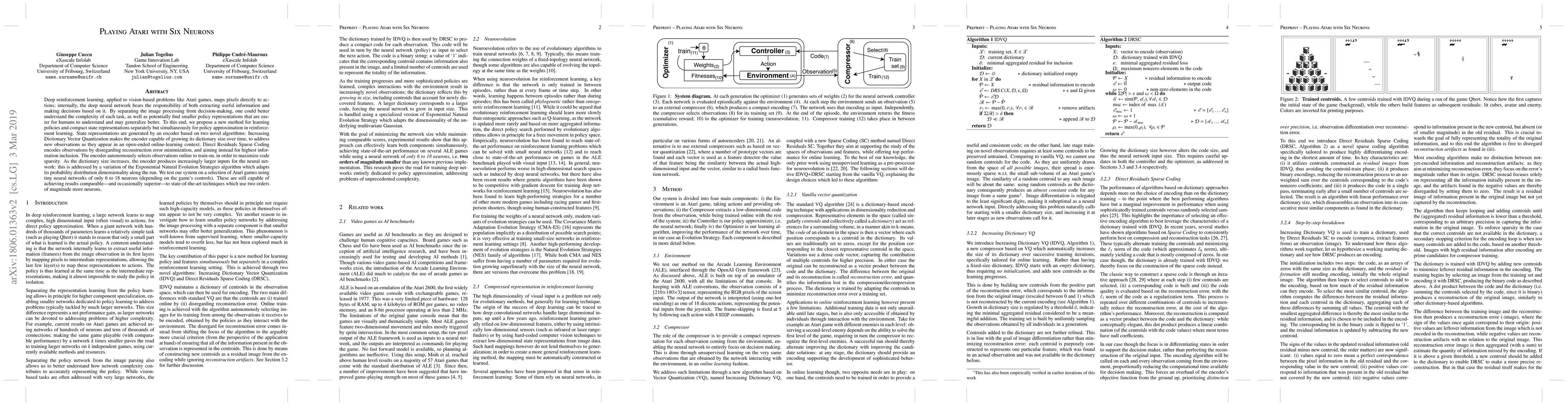 Deep reinforcement learning, applied to vision-based problems like Atari games, maps pixels directly to actions; internally, the deep neural network bears the responsibility of both extracting useful information and making decisions based on it. By separating the image processing from decision-making, one could better understand the complexity of each task, as well as potentially find smaller policy representations that are easier for humans to understand and may generalize better. To this end, we propose a new method for learning policies and compact state representations separately but simultaneously for policy approximation in reinforcement learning. State representations are generated by an encoder based on two novel algorithms: Increasing Dictionary Vector Quantization makes the encoder capable of growing its dictionary size over time, to address new observations as they appear in an open-ended online-learning context; Direct Residuals Sparse Coding encodes observations by disregarding reconstruction error minimization, and aiming instead for highest information inclusion. The encoder autonomously selects observations online to train on, in order to maximize code sparsity. As the dictionary size increases, the encoder produces increasingly larger inputs for the neural network: this is addressed by a variation of the Exponential Natural Evolution Strategies algorithm which adapts its probability distribution dimensionality along the run. We test our system on a selection of Atari games using tiny neural networks of only 6 to 18 neurons (depending on the game's controls). These are still capable of achieving results comparable---and occasionally superior---to state-of-the-art techniques which use two orders of magnitude more neurons.