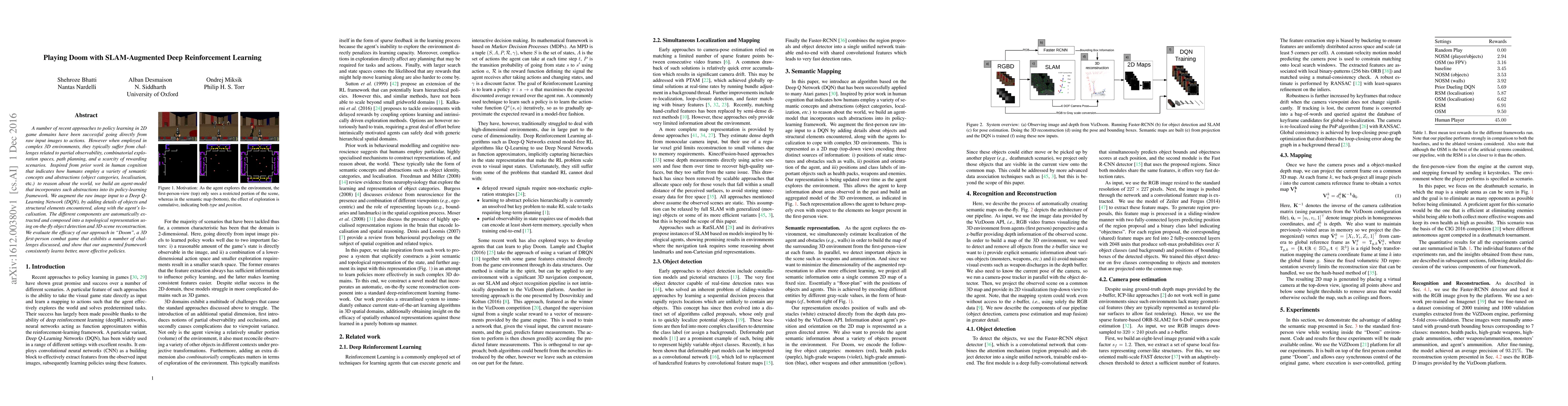 A number of recent approaches to policy learning in 2D game domains have been successful going directly from raw input images to actions. However when employed in complex 3D environments, they typically suffer from challenges related to partial observability, combinatorial exploration spaces, path planning, and a scarcity of rewarding scenarios. Inspired from prior work in human cognition that indicates how humans employ a variety of semantic concepts and abstractions (object categories, localisation, etc.) to reason about the world, we build an agent-model that incorporates such abstractions into its policy-learning framework. We augment the raw image input to a Deep Q-Learning Network (DQN), by adding details of objects and structural elements encountered, along with the agent's localisation. The different components are automatically extracted and composed into a topological representation using on-the-fly object detection and 3D-scene reconstruction.We evaluate the efficacy of our approach in Doom, a 3D first-person combat game that exhibits a number of challenges discussed, and show that our augmented framework consistently learns better, more effective policies.