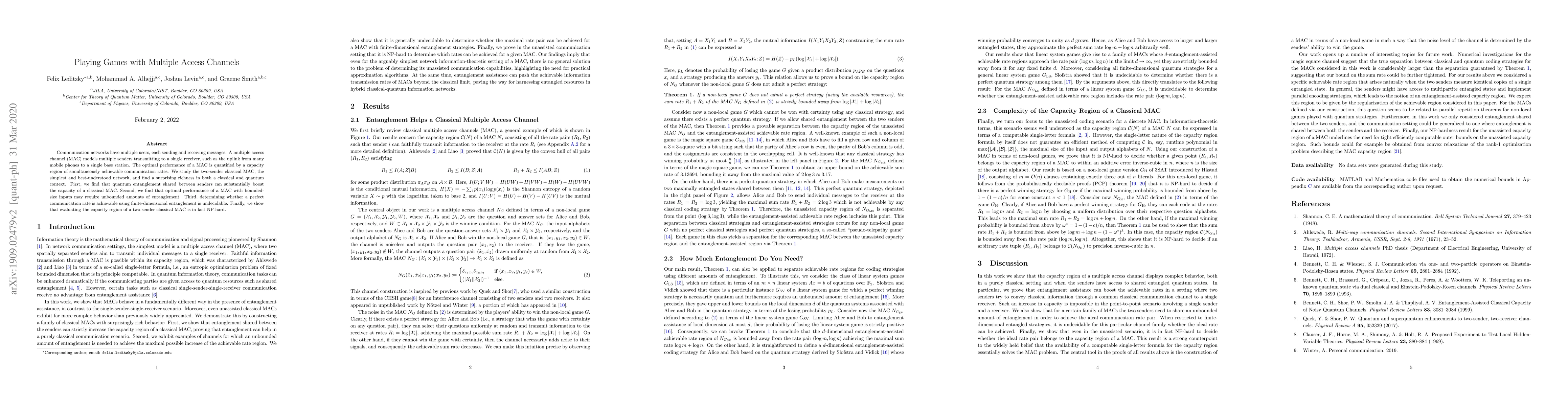 Communication networks have multiple users, each sending and receiving messages. A multiple access channel (MAC) models multiple senders transmitting to a single receiver, such as the uplink from many mobile phones to a single base station. The optimal performance of a MAC is quantified by a capacity region of simultaneously achievable communication rates. We study the two-sender classical MAC, the simplest and best-understood network, and find a surprising richness in both a classical and quantum context. First, we find that quantum entanglement shared between senders can substantially boost the capacity of a classical MAC. Second, we find that optimal performance of a MAC with bounded-size inputs may require unbounded amounts of entanglement. Third, determining whether a perfect communication rate is achievable using finite-dimensional entanglement is undecidable. Finally, we show that evaluating the capacity region of a two-sender classical MAC is in fact NP-hard.