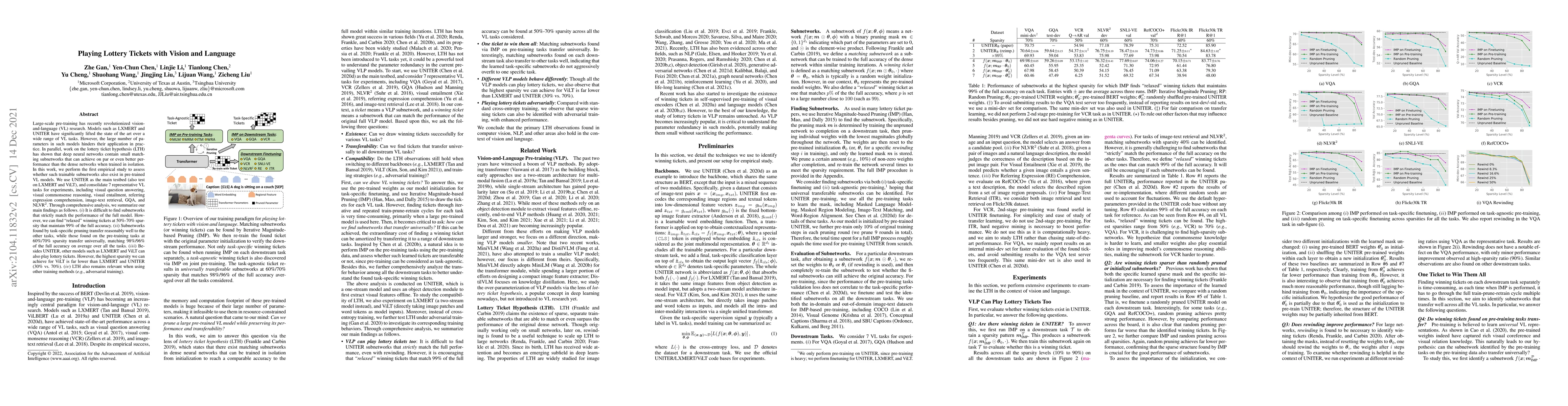 Researchers found that trainable subnetworks in pre-trained vision-and-language models can achieve high accuracy with reduced parameters, but not always matching the full model's performance. These subnetworks, called 'lottery tickets,' transfer well across tasks.