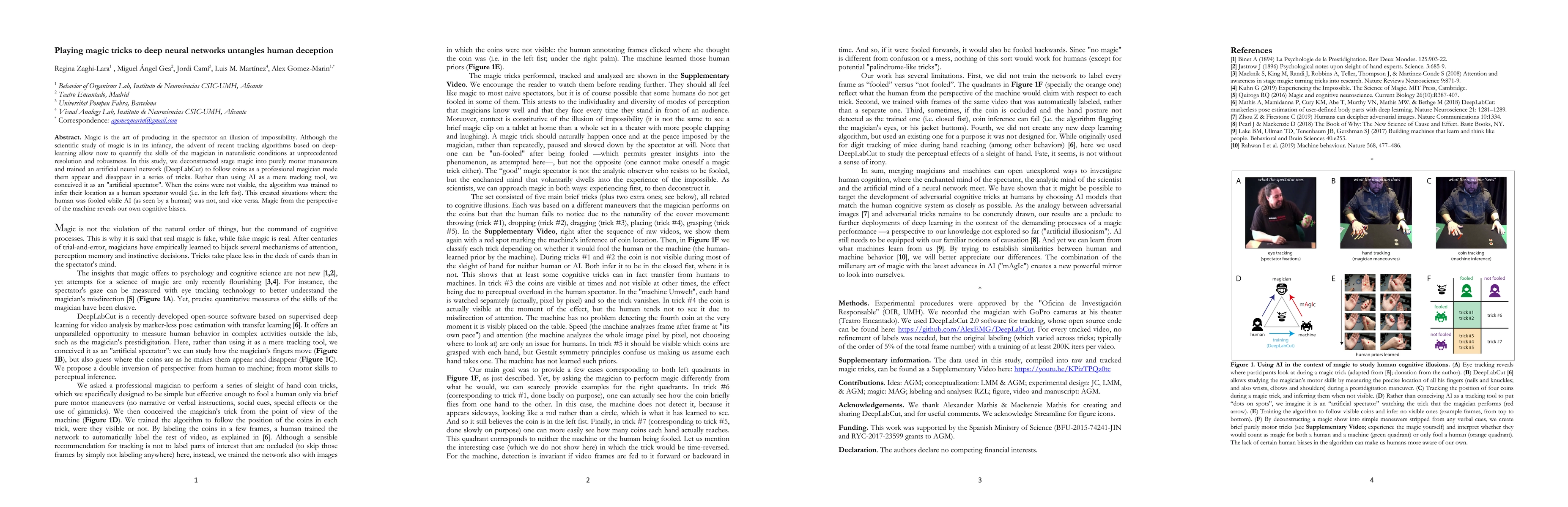 Magic is the art of producing in the spectator an illusion of impossibility. Although the scientific study of magic is in its infancy, the advent of recent tracking algorithms based on deep learning allow now to quantify the skills of the magician in naturalistic conditions at unprecedented resolution and robustness. In this study, we deconstructed stage magic into purely motor maneuvers and trained an artificial neural network (DeepLabCut) to follow coins as a professional magician made them appear and disappear in a series of tricks. Rather than using AI as a mere tracking tool, we conceived it as an "artificial spectator". When the coins were not visible, the algorithm was trained to infer their location as a human spectator would (i.e. in the left fist). This created situations where the human was fooled while AI (as seen by a human) was not, and vice versa. Magic from the perspective of the machine reveals our own cognitive biases.