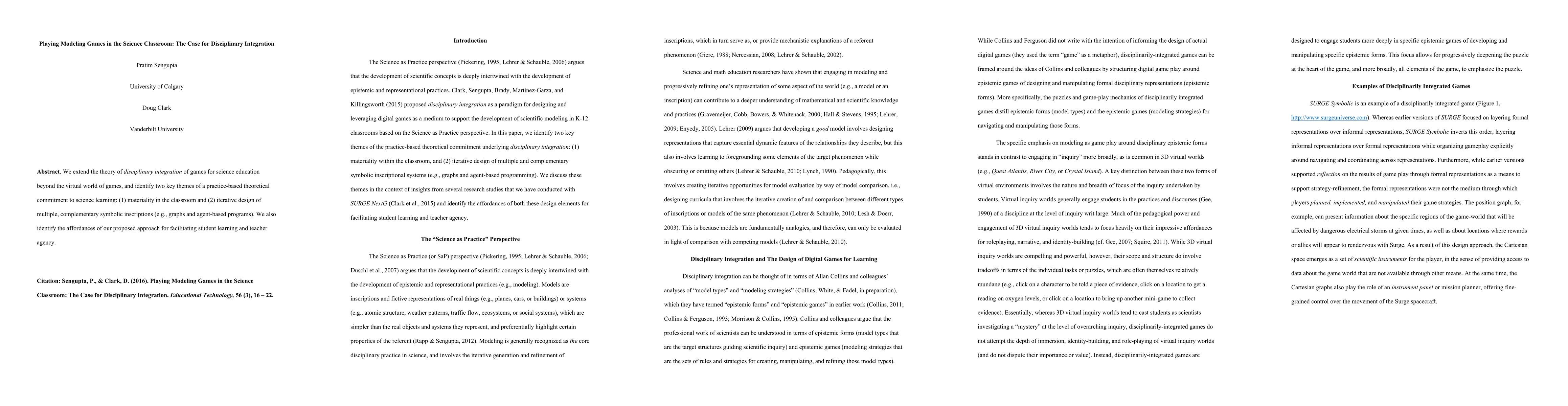 We extend the theory of disciplinary integration of games for science education beyond the virtual world of games, and identify two key themes of a practice-based theoretical commitment to science learning: (1) materiality in the classroom and (2) iterative design of multiple, complementary symbolic inscriptions (e.g., graphs and agent-based programs). We also identify the affordances of our proposed approach for facilitating student learning and teacher agency.