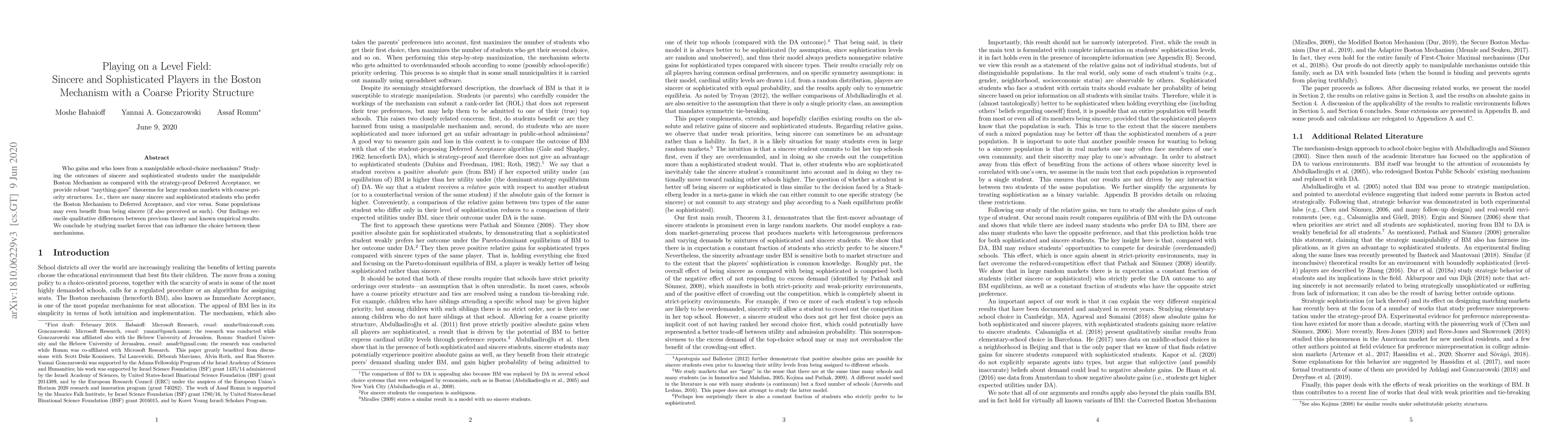 Who gains and who loses from a manipulable school-choice mechanism? Studying the outcomes of sincere and sophisticated students under the manipulable Boston Mechanism as compared with the strategy-proof Deferred Acceptance, we provide robust "anything-goes" theorems for large random markets with coarse priority structures. I.e., there are many sincere and sophisticated students who prefer the Boston Mechanism to Deferred Acceptance, and vice versa. Some populations may even benefit from being sincere (if also perceived as such). Our findings reconcile qualitative differences between previous theory and known empirical results. We conclude by studying market forces that can influence the choice between these mechanisms.