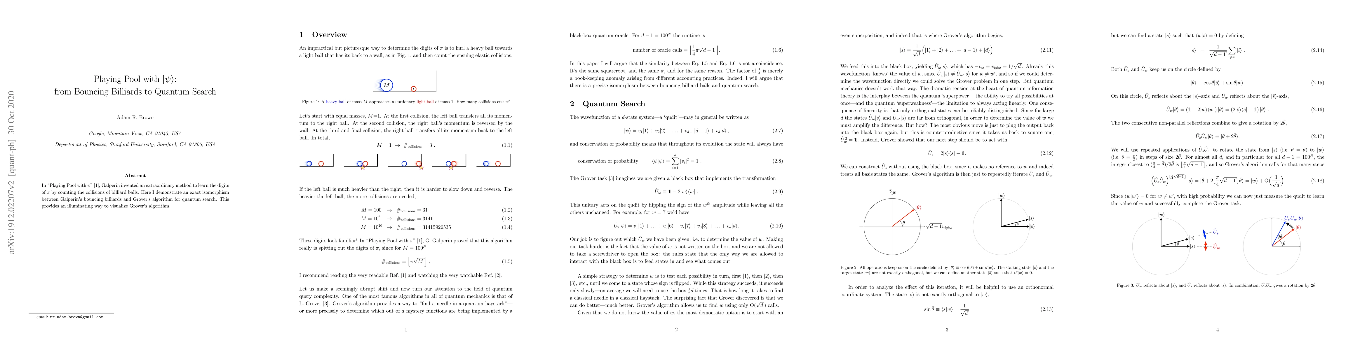In "Playing Pool with $\pi$", Galperin invented an extraordinary method to learn the digits of $\pi$ by counting the collisions of billiard balls. Here I demonstrate an exact isomorphism between Galperin's bouncing billiards and Grover's algorithm for quantum search. This provides an illuminating way to visualize Grover's algorithm.