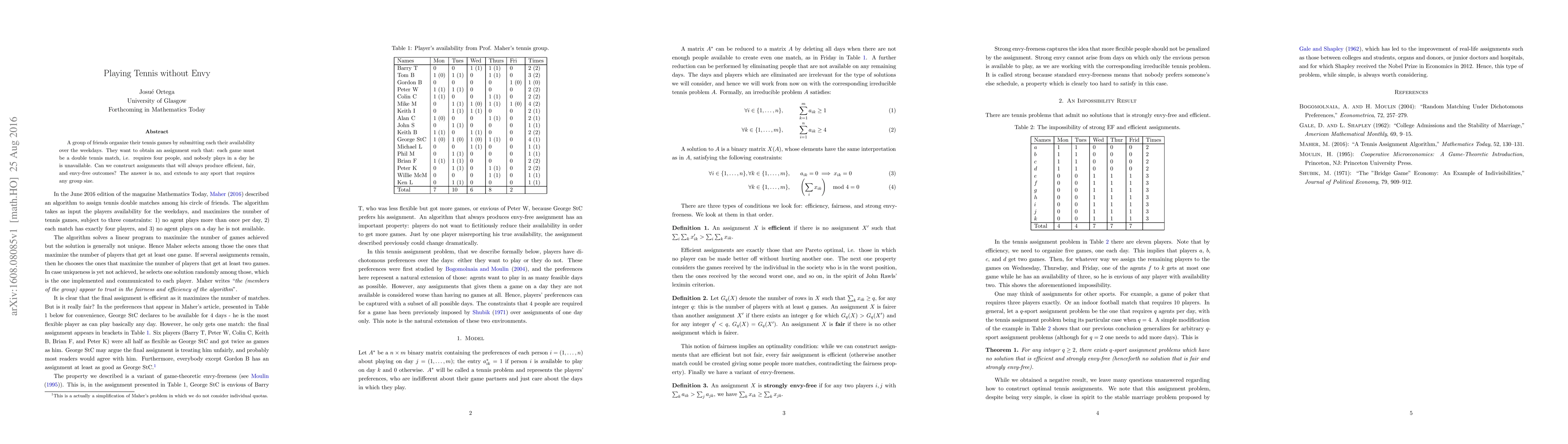A group of friends organize their tennis games by submitting each their availability over the weekdays. They want to obtain an assignment such that: each game must be a double tennis match, i.e. requires four people, and nobody plays in a day he is unavailable. Can we construct assignments that will always produce efficient, fair, and envy-free outcomes? The answer is no, and extends to any sport that requires any group size.