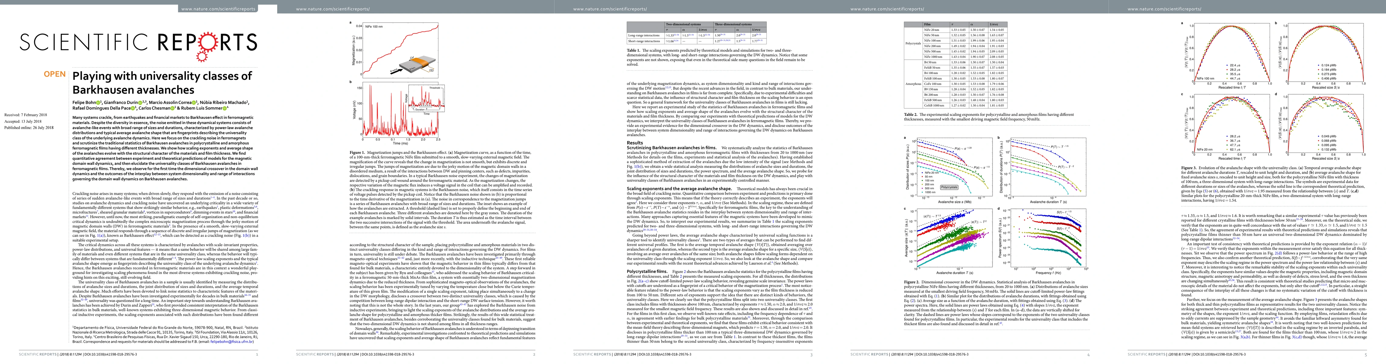 This research investigates the universality classes of Barkhausen avalanches in ferromagnetic materials, focusing on the crackling noise dynamics in polycrystalline and amorphous films of varying thicknesses. It reveals how scaling exponents and avalanche shapes evolve with material structure and thickness, finding dimensional crossovers and confirming theoretical models of magnetic domain wall dynamics.