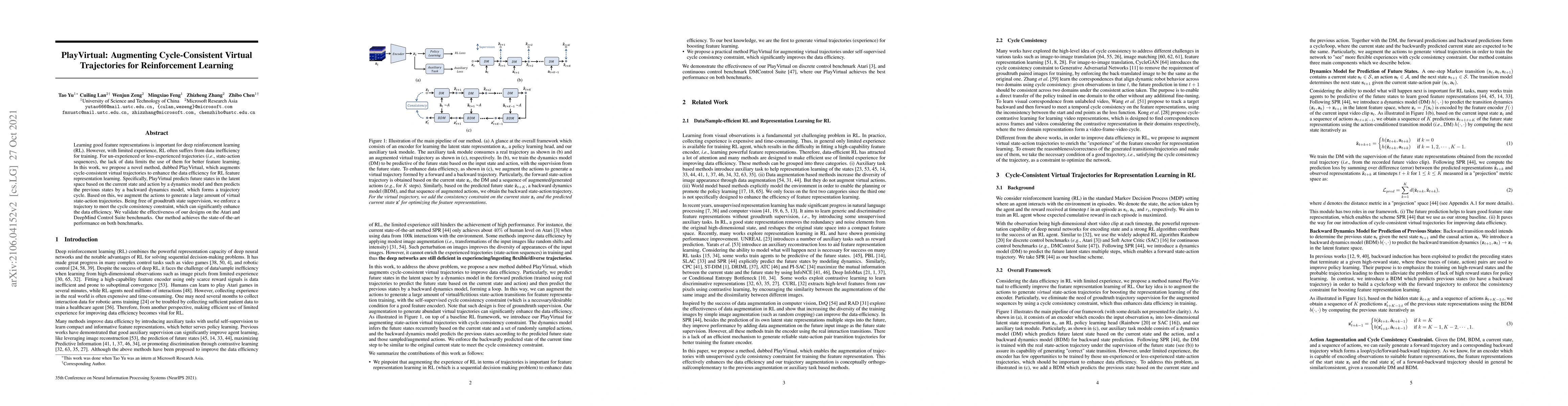 PlayVirtual enhances reinforcement learning feature representation by augmenting cycle-consistent virtual trajectories, significantly improving data efficiency without requiring ground truth state supervision. The method achieves state-of-the-art performance on Atari and DeepMind Control Suite benchmarks.