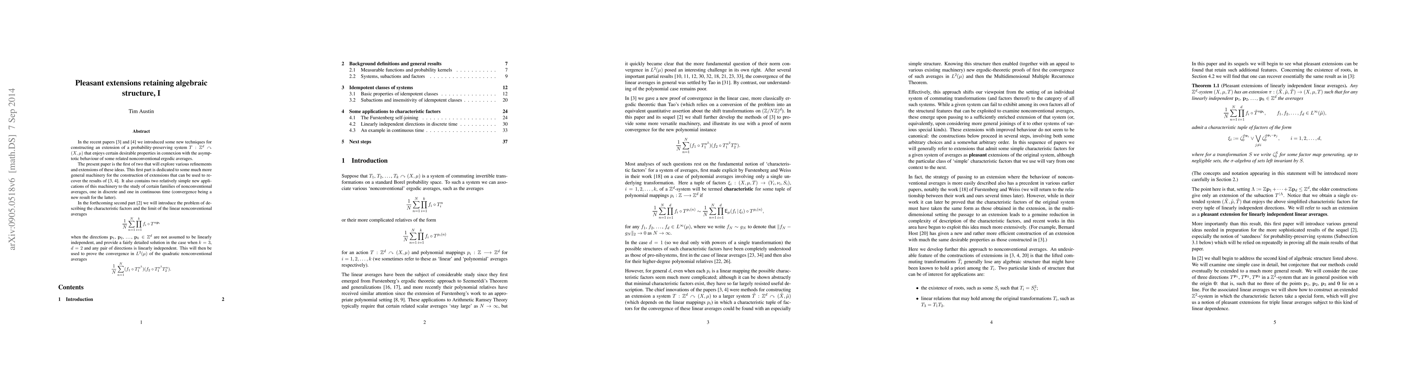 In two recent papers we introduced some new techniques for constructing an extension of a probability-preserving system $T:\mathbb{Z}^d\curvearrowright (X,\mu)$ that enjoys certain desirable properties in connexion with the asymptotic behaviour of some related nonconventional ergodic averages. The present paper is the first of two that will explore various refinements and extensions of these ideas. This first part is dedicated to some much more general machinery for the construction of extensions that can be used to recover various earlier results. It also contains two relatively simple new applications of this machinery to the study of certain families of nonconventional averages, one in discrete and one in continuous time (convergence being a new result for the latter). In the forthcoming second part (arXiv:0910.0907) we will introduce the problem of describing the characteristic factors and the limit of the linear nonconventional averages $\frac{1}{N}\sum_{n=1}^N \prod_{i=1}^kf_i\circ T^{n\bf{p}_i}$ when the directions $\bf{p}_1$, $\bf{p}_2$, \ldots, $\bf{p}_k \in \mathbb{Z}^d$ are not assumed to be linearly independent, and provide a fairly detailed solution in the case when k = 3, d = 2 and any pair of directions is linearly independent. This will then be used to prove the convergence in $L^2(\mu)$ of the quadratic nonconventional averages $\frac{1}{N}\sum_{n=1}^N (f_1\circ T_1^{n^2})(f_2\circ T_1^{n^2}T_2^n)$.