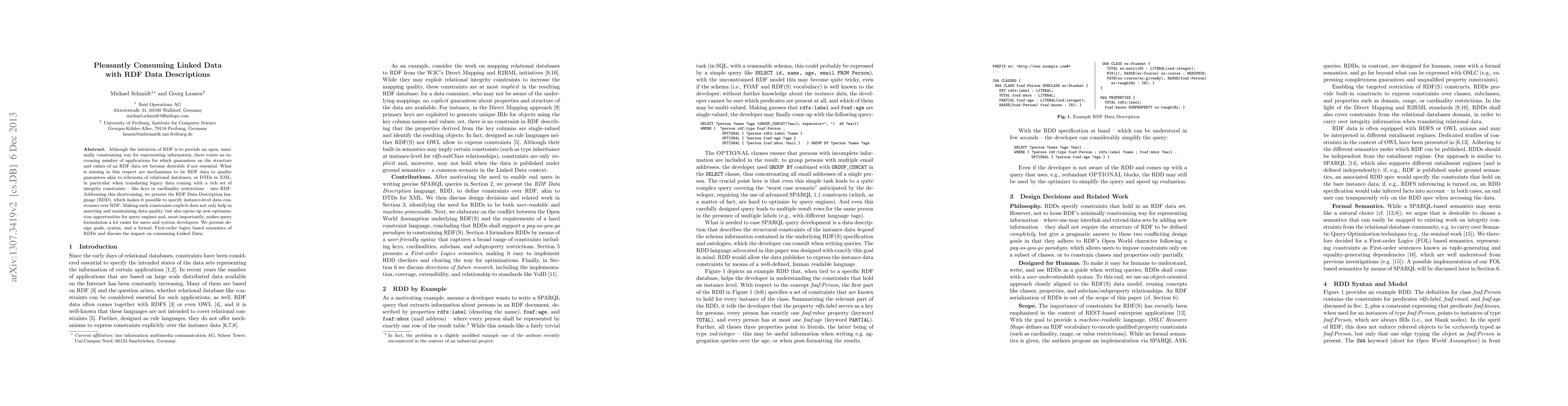 The paper introduces RDF Data Description (RDD) to specify instance-level constraints on RDF data, enhancing data quality and query optimization. It presents design goals, syntax, and semantics based on First-order logic, aiming to improve the consumption of Linked Data.