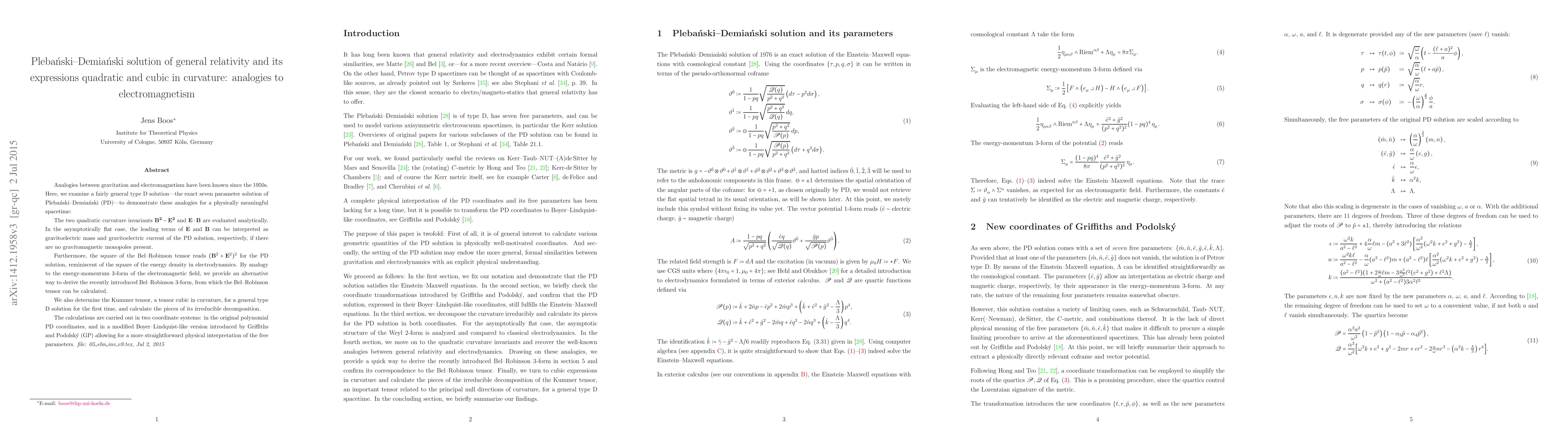 This paper explores analogies between gravitation and electromagnetism through the Plebański-Demiański (PD) solution of general relativity, evaluating quadratic and cubic curvature invariants. It demonstrates that the PD solution's leading terms can be interpreted as gravitoelectric mass and current, analogous to electromagnetic fields, and introduces the Kummer tensor for the first time in a general type D solution.