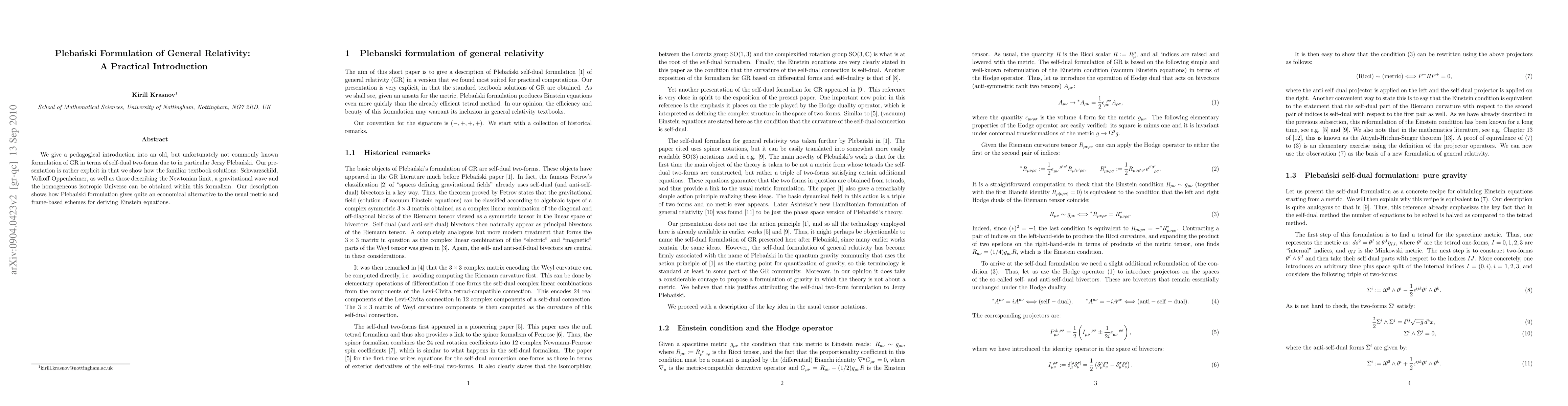 We give a pedagogical introduction into an old, but unfortunately not commonly known formulation of GR in terms of self-dual two-forms due to in particular Jerzy Plebanski. Our presentation is rather explicit in that we show how the familiar textbook solutions: Schwarzschild, Volkoff-Oppenheimer, as well as those describing the Newtonian limit, a gravitational wave and the homogeneous isotropic Universe can be obtained within this formalism. Our description shows how Plebanski formulation gives quite an economical alternative to the usual metric and frame-based schemes for deriving Einstein equations.