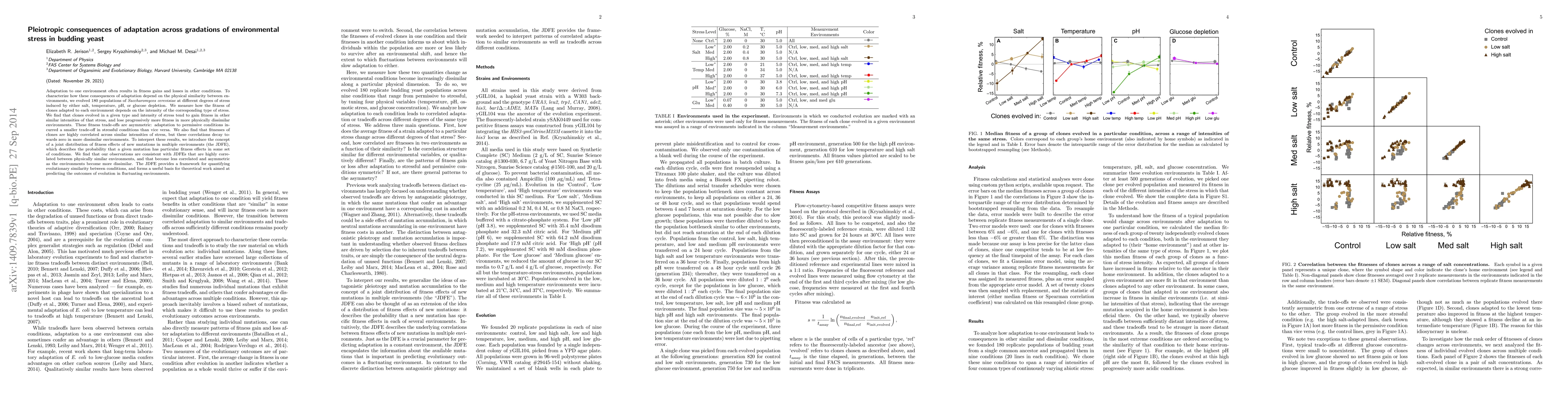 Adaptation to one environment often results in fitness gains and losses in other conditions. To characterize how these consequences of adaptation depend on the physical similarity between environments, we evolved 180 populations of Saccharomyces cerevisiae at different degrees of stress induced by either salt, temperature, pH, or glucose depletion. We measure how the fitness of clones adapted to each environment depends on the intensity of the corresponding type of stress. We find that clones evolved in a given type and intensity of stress tend to gain fitness in other similar intensities of that stress, and lose progressively more fitness in more physically dissimilar environments. These fitness trade-offs are asymmetric: adaptation to permissive conditions incurred a smaller trade-off in stressful conditions than vice versa. We also find that fitnesses of clones are highly correlated across similar intensities of stress, but these correlations decay towards zero in more dissimilar environments. To interpret these results, we introduce the concept of a joint distribution of fitness effects of new mutations in multiple environments (the JDFE), which describes the probability that a given mutation has particular fitness effects in some set of conditions. We find that our observations are consistent with JDFEs that are highly correlated between physically similar environments, and that become less correlated and asymmetric as the environments become more dissimilar. The JDFE provides a framework for quantifying evolutionary similarity between conditions, and forms a useful basis for theoretical work aimed at predicting the outcomes of evolution in fluctuating environments.