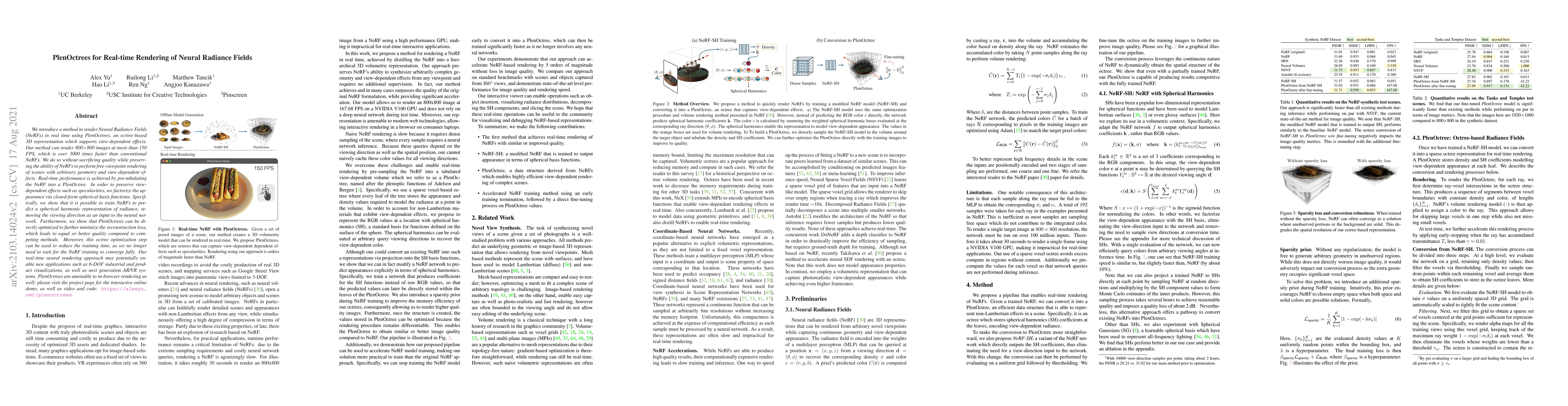 This paper presents PlenOctrees, an octree-based method for real-time rendering of Neural Radiance Fields (NeRFs), achieving over 150 FPS for 800x800 images, significantly faster than conventional NeRFs without sacrificing quality. The method uses spherical basis functions to preserve view-dependent effects and optimizes the octree structure to reduce training time and improve rendering quality.