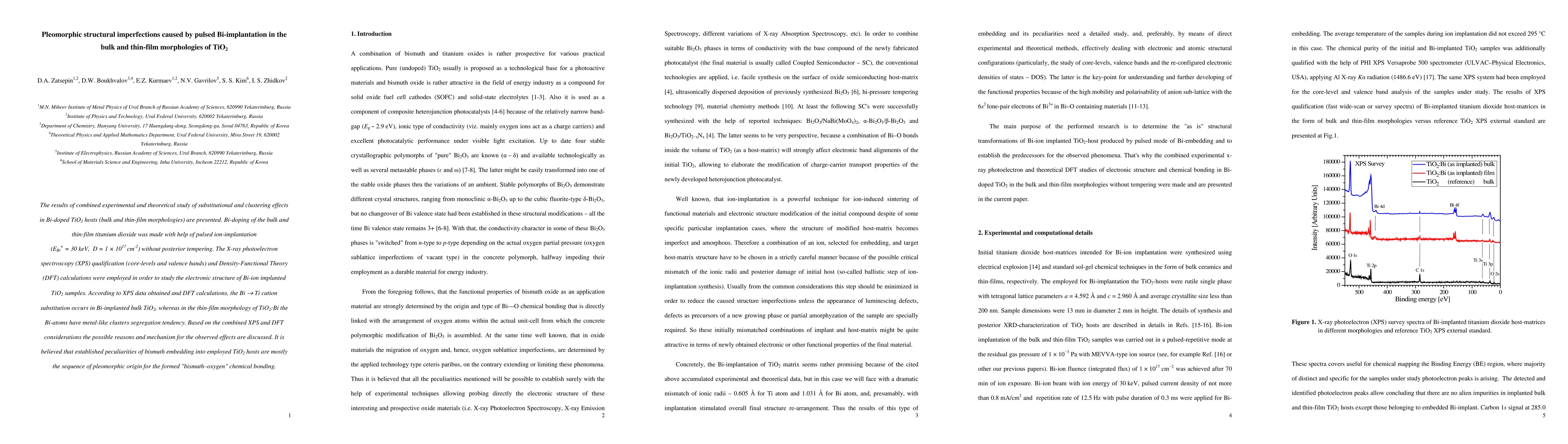 This paper investigates the effects of pulsed Bi-implantation on the structural and electronic properties of TiO2 in both bulk and thin-film forms. The study reveals that Bi-doping leads to Bi -> Ti cation substitution in bulk TiO2, while Bi-atoms form metal-like clusters in thin-film TiO2, suggesting pleomorphic structural imperfections due to different bonding mechanisms.