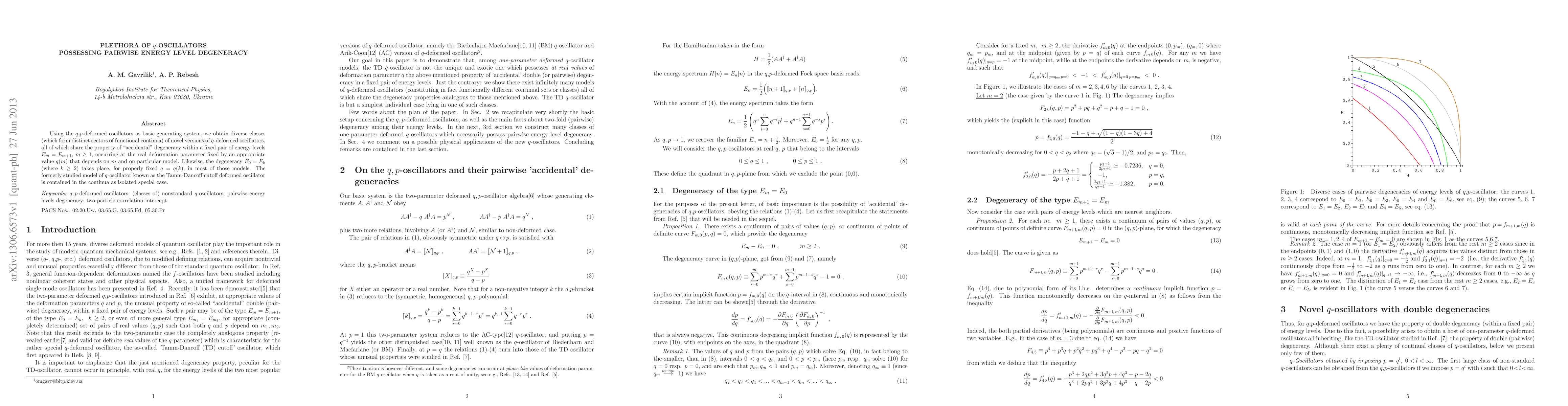 This paper explores various classes of q-deformed oscillators derived from q,p-deformed oscillators, revealing "accidental" degeneracy within specific pairs of energy levels, notably E_{m} = E_{m+1}, and occasionally E_{0} = E_{k} for certain deformation parameters. The Tamm-Dancoff cutoff deformed oscillator is identified as a special case within these new models.