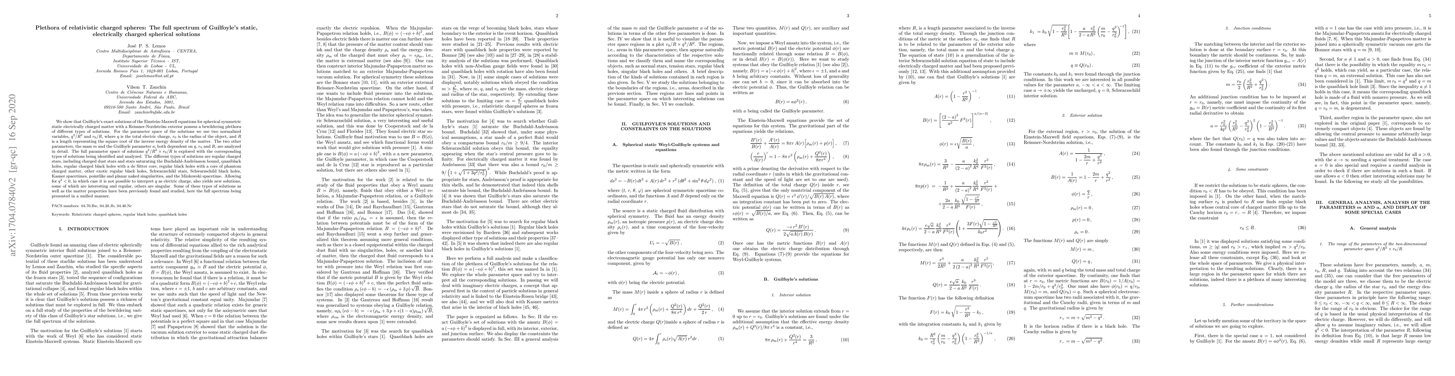 This paper explores the diverse solutions of Guilfoyle's static, electrically charged spherical solutions to the Einstein-Maxwell equations, revealing a variety of configurations including regular charged stars, quasiblack holes, and exotic black holes. The parameter space is analyzed using normalized variables, identifying and categorizing different types of solutions within the full spectrum.