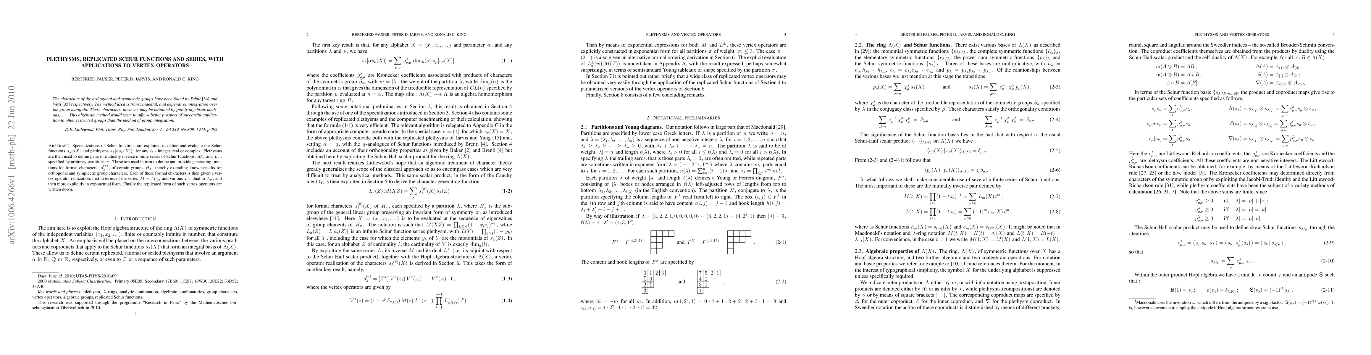 Specializations of Schur functions are exploited to define and evaluate the Schur functions s_\lambda[\alpha X] and plethysms s_\lambda[\alpha s_\nu(X))] for any \alpha - integer, real or complex. Plethysms are then used to define pairs of mutually inverse infinite series of Schur functions, M_\pi and L_\pi, specified by arbitrary partitions \pi. These are used in turn to define and provide generating functions for formal characters, s_\lambda^{(\pi)}, of certain groups H_\pi, thereby extending known results for orthogonal and symplectic group characters. Each of these formal characters is then given a vertex operator realization, first in terms of the series M=M_{(0)} and various L_\sigma^\perp dual to L_\sigma, and then more explicitly in exponential form. Finally the replicated form of such vertex operators are written down.