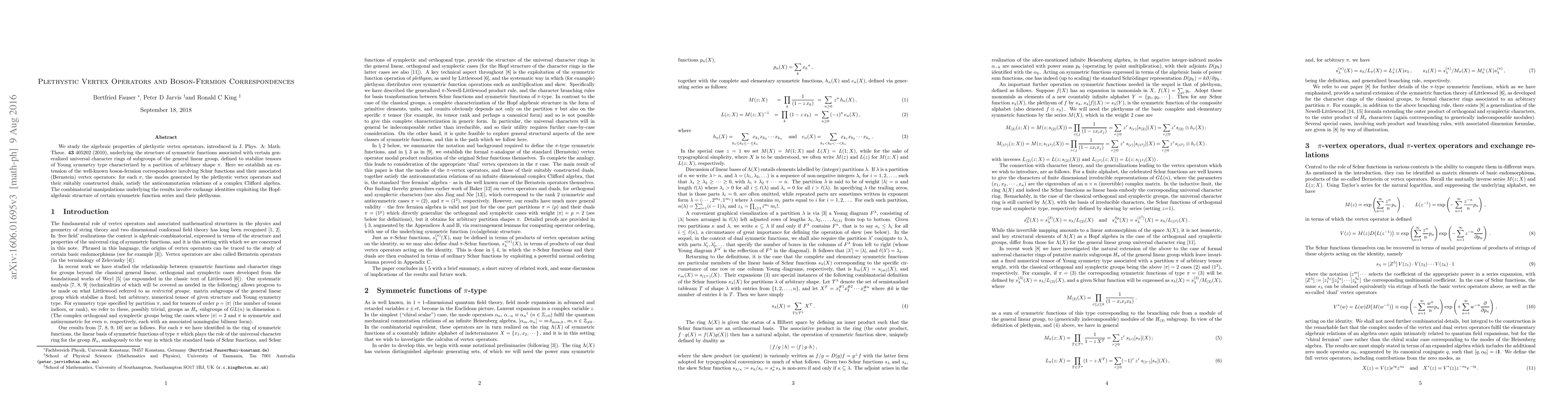 The research explores algebraic properties of plethystic vertex operators, extending the boson-fermion correspondence to involve complex Clifford algebras through Schur functions and their associated vertex operators.