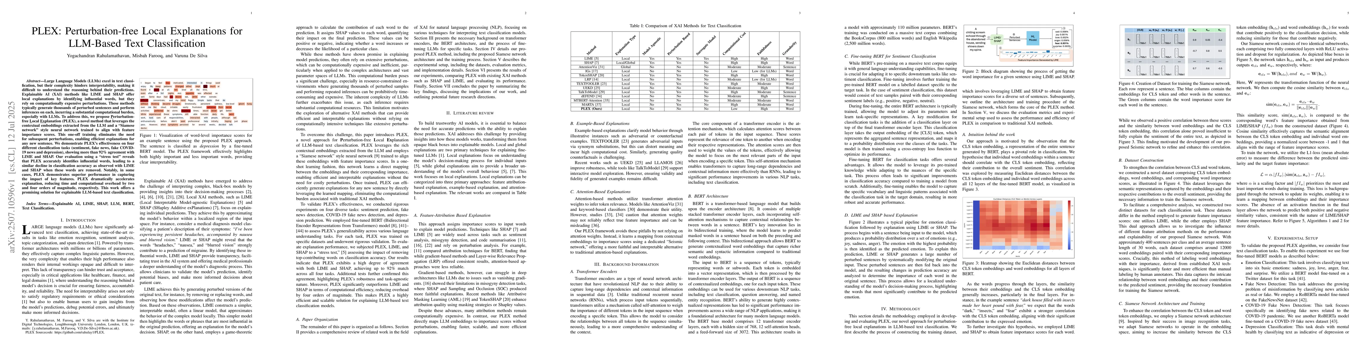 Large Language Models (LLMs) excel in text classification, but their complexity hinders interpretability, making it difficult to understand the reasoning behind their predictions. Explainable AI (XAI) methods like LIME and SHAP offer local explanations by identifying influential words, but they rely on computationally expensive perturbations. These methods typically generate thousands of perturbed sentences and perform inferences on each, incurring a substantial computational burden, especially with LLMs. To address this, we propose \underline{P}erturbation-free \underline{L}ocal \underline{Ex}planation (PLEX), a novel method that leverages the contextual embeddings extracted from the LLM and a ``Siamese network" style neural network trained to align with feature importance scores. This one-off training eliminates the need for subsequent perturbations, enabling efficient explanations for any new sentence. We demonstrate PLEX's effectiveness on four different classification tasks (sentiment, fake news, fake COVID-19 news and depression), showing more than 92\% agreement with LIME and SHAP. Our evaluation using a ``stress test" reveals that PLEX accurately identifies influential words, leading to a similar decline in classification accuracy as observed with LIME and SHAP when these words are removed. Notably, in some cases, PLEX demonstrates superior performance in capturing the impact of key features. PLEX dramatically accelerates explanation, reducing time and computational overhead by two and four orders of magnitude, respectively. This work offers a promising solution for explainable LLM-based text classification.
