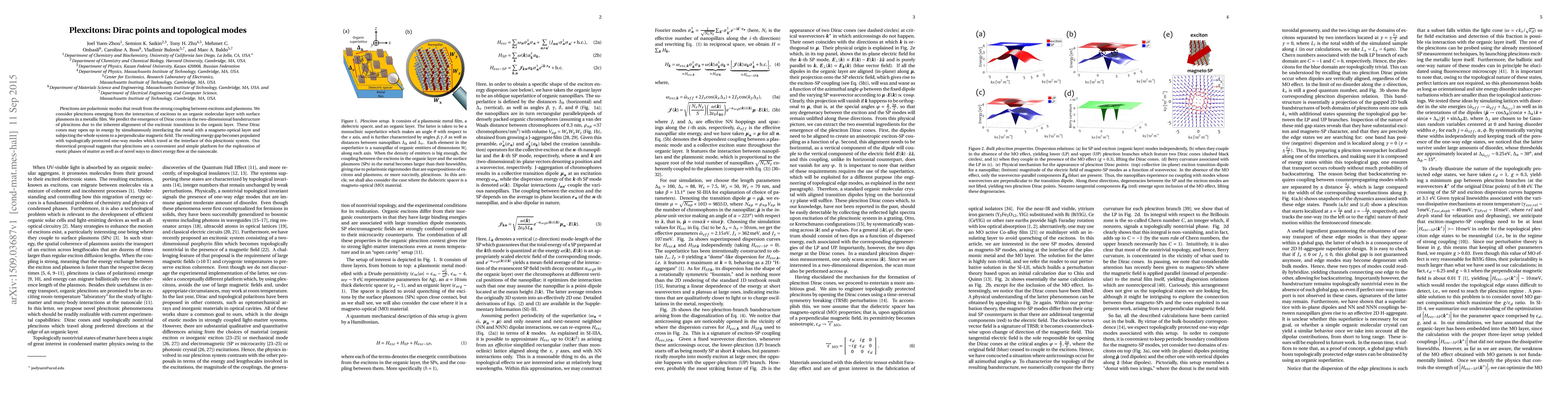 This paper explores plexcitons, polaritonic modes formed by strong coupling between excitons and plasmons, and predicts the emergence of Dirac cones in their band structure due to the alignment of excitonic transitions in an organic layer. The introduction of a magnetic field and a magneto-optical layer can open an energy gap, leading to topologically protected one-way modes, suggesting plexcitons as a platform for studying exotic phases of matter and controlling energy flow at the nanoscale.