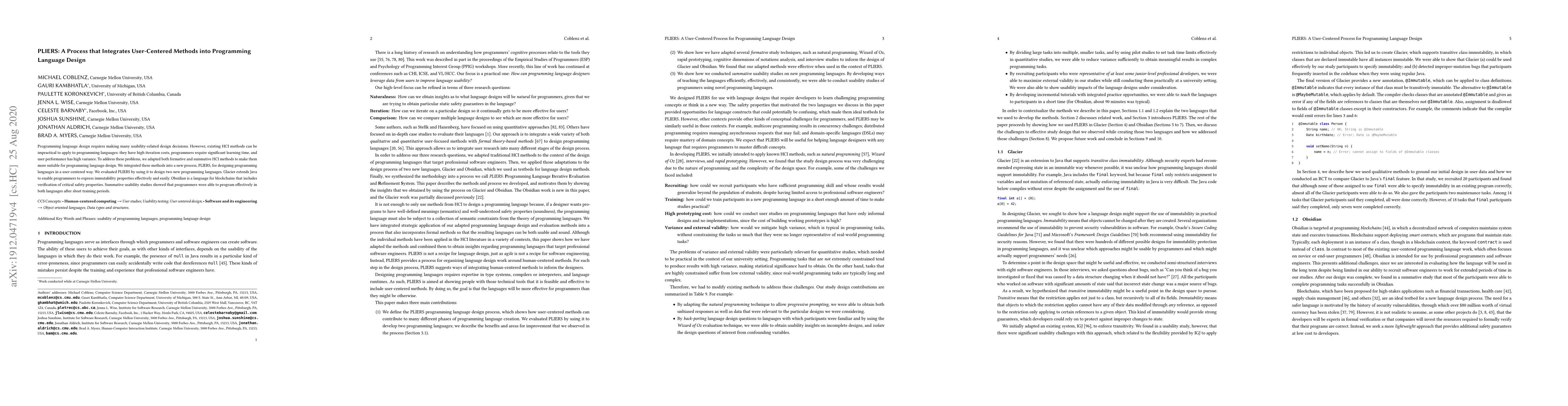 PLIERS integrates adapted HCI methods into programming language design, enabling effective usability studies with minimal training. The process was used to design Glacier and Obsidian, demonstrating improved programmer performance in summative usability tests.