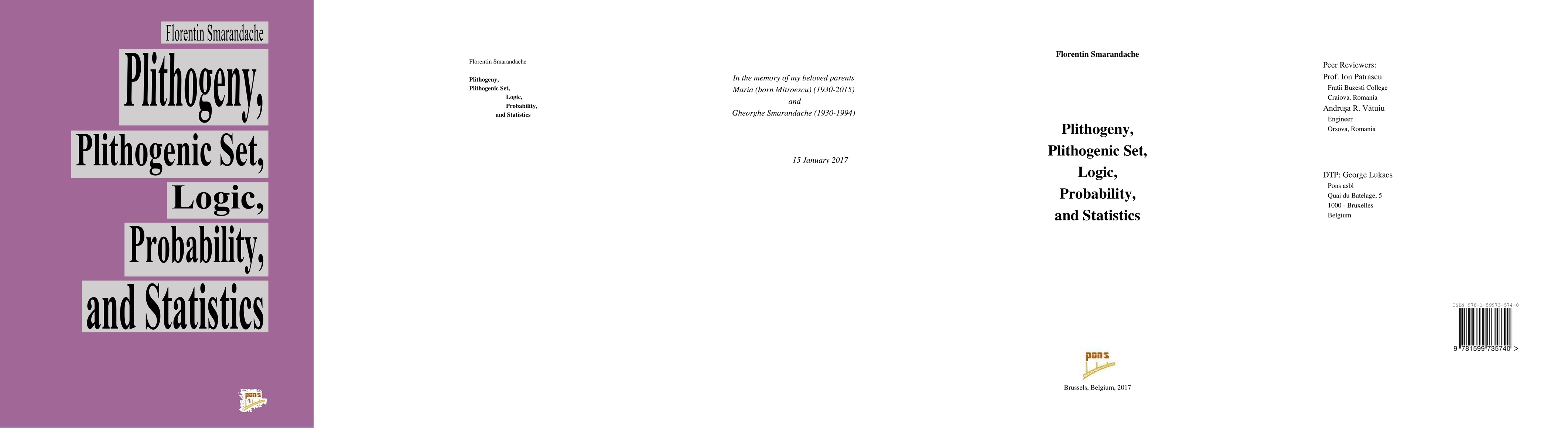 In this book we introduce the plithogenic set (as generalization of crisp, fuzzy, intuitionistic fuzzy, and neutrosophic sets), plithogenic logic (as generalization of classical, fuzzy, intuitionistic fuzzy, and neutrosophic logics), plithogenic probability (as generalization of classical, imprecise, and neutrosophic probabilities), and plithogenic statistics (as generalization of classical, and neutrosophic statistics). Plithogenic Set is a set whose elements are characterized by one or more attributes, and each attribute may have many values. An attribute value v has a corresponding (fuzzy, intuitionistic fuzzy, or neutrosophic) degree of appurtenance d(x,v) of the element x, to the set P, with respect to some given criteria. In order to obtain a better accuracy for the plithogenic aggregation operators in the plithogenic set, logic, probability and for a more exact inclusion (partial order), a (fuzzy, intuitionistic fuzzy, or neutrosophic) contradiction (dissimilarity) degree is defined between each attribute value and the dominant (most important) attribute value. The plithogenic intersection and union are linear combinations of the fuzzy operators tnorm and tconorm, while the plithogenic complement, inclusion, equality are influenced by the attribute values contradiction (dissimilarity) degrees. Formal definitions of plithogenic set, logic, probability, statistics are presented into the book, followed by plithogenic aggregation operators, various theorems related to them, and afterwards examples and applications of these new concepts in our everyday life.