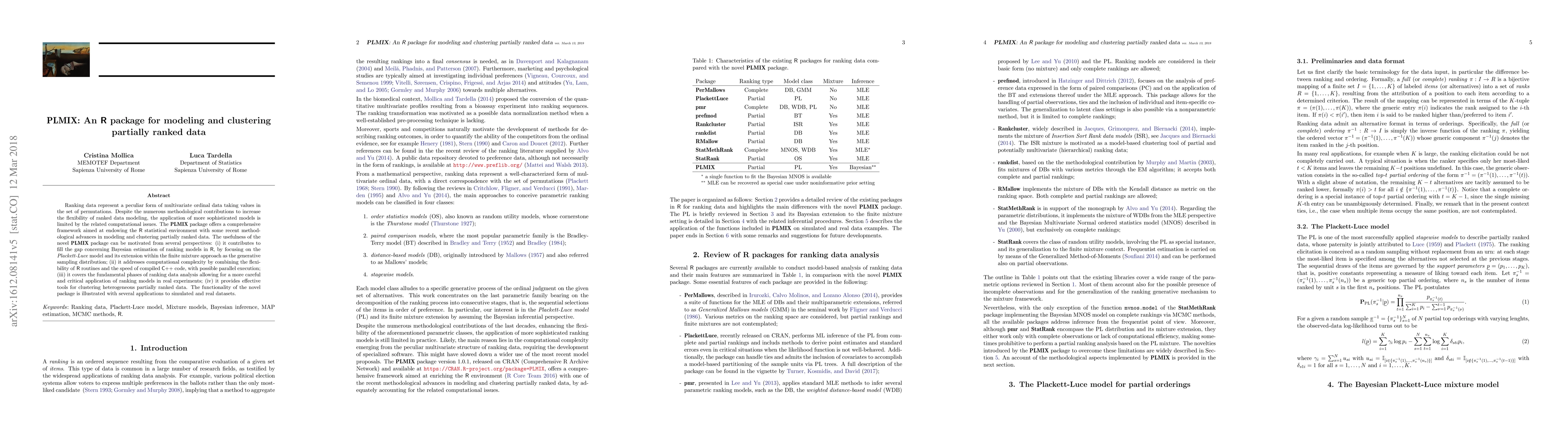 The PLMIX R package enhances statistical modeling and clustering of partially ranked data by integrating advanced Bayesian estimation techniques for the Plackett-Luce model and its mixture extensions, while addressing computational efficiency through a combination of R and C++ code. It facilitates comprehensive analysis and clustering of heterogeneous partially ranked datasets.