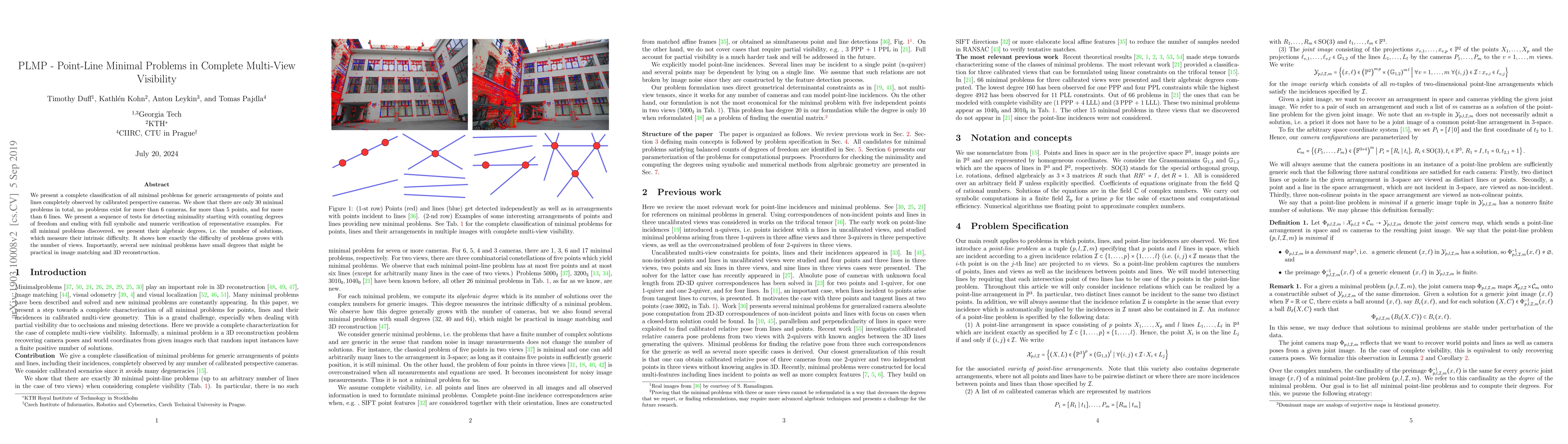 We present a complete classification of all minimal problems for generic arrangements of points and lines completely observed by calibrated perspective cameras. We show that there are only 30 minimal problems in total, no problems exist for more than 6 cameras, for more than 5 points, and for more than 6 lines. We present a sequence of tests for detecting minimality starting with counting degrees of freedom and ending with full symbolic and numeric verification of representative examples. For all minimal problems discovered, we present their algebraic degrees, i.e. the number of solutions, which measure their intrinsic difficulty. It shows how exactly the difficulty of problems grows with the number of views. Importantly, several new minimal problems have small degrees that might be practical in image matching and 3D reconstruction.