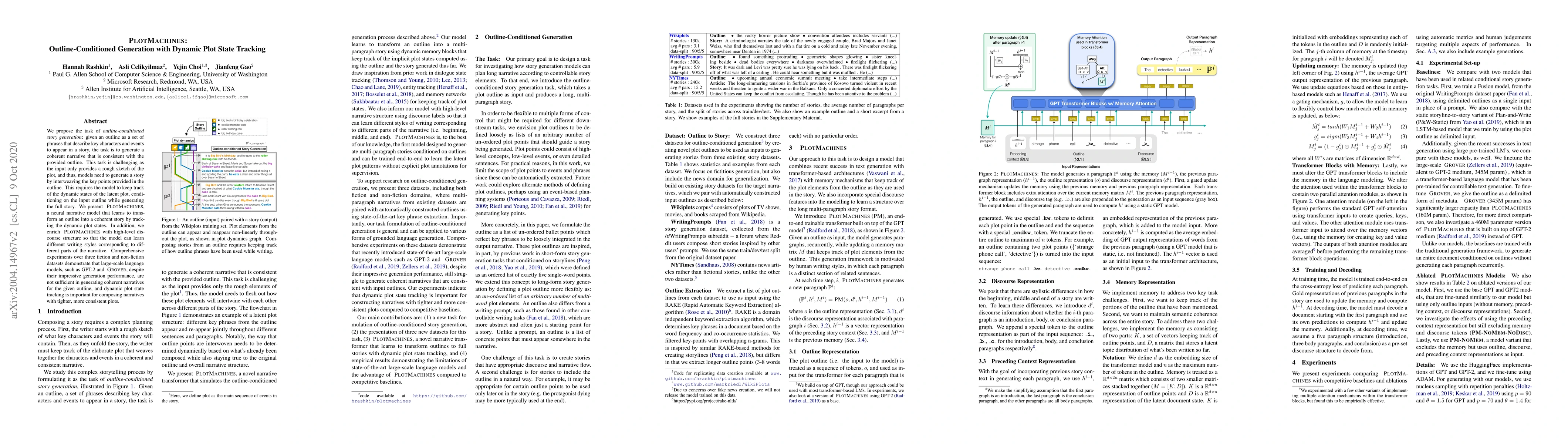The paper introduces PlotMachines, a neural narrative model designed to generate coherent stories from outlines by dynamically tracking plot states. Experiments show that while large-scale language models can generate text, they lack the ability to create tightly consistent plots, highlighting the importance of dynamic plot state tracking.