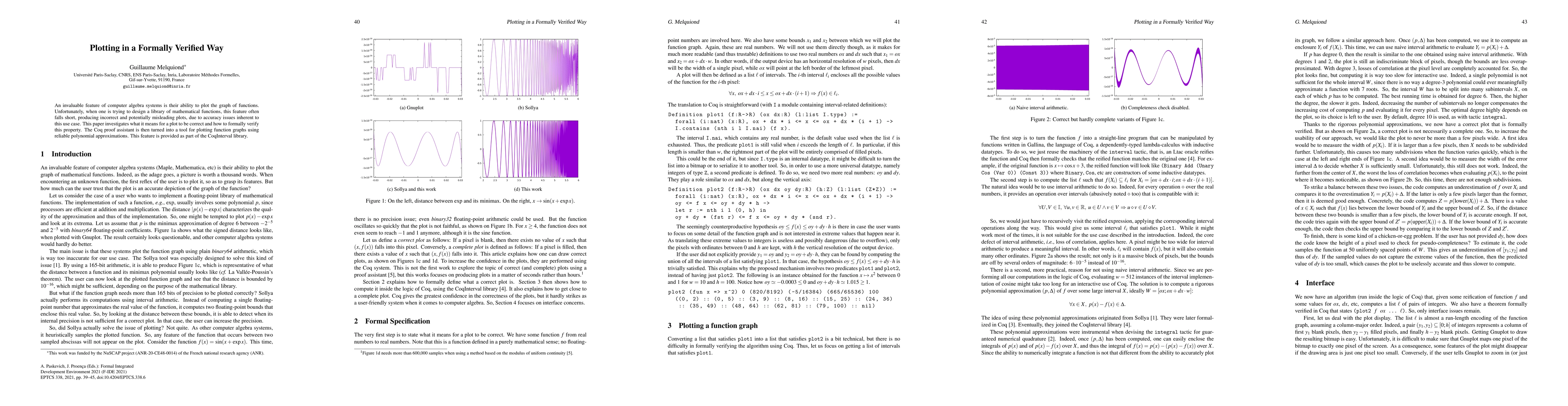 This paper explores the formal verification of correct plotting in computer algebra systems, addressing accuracy issues, and utilizes the Coq proof assistant to develop reliable polynomial approximations for plotting functions, implemented in the CoqInterval library.