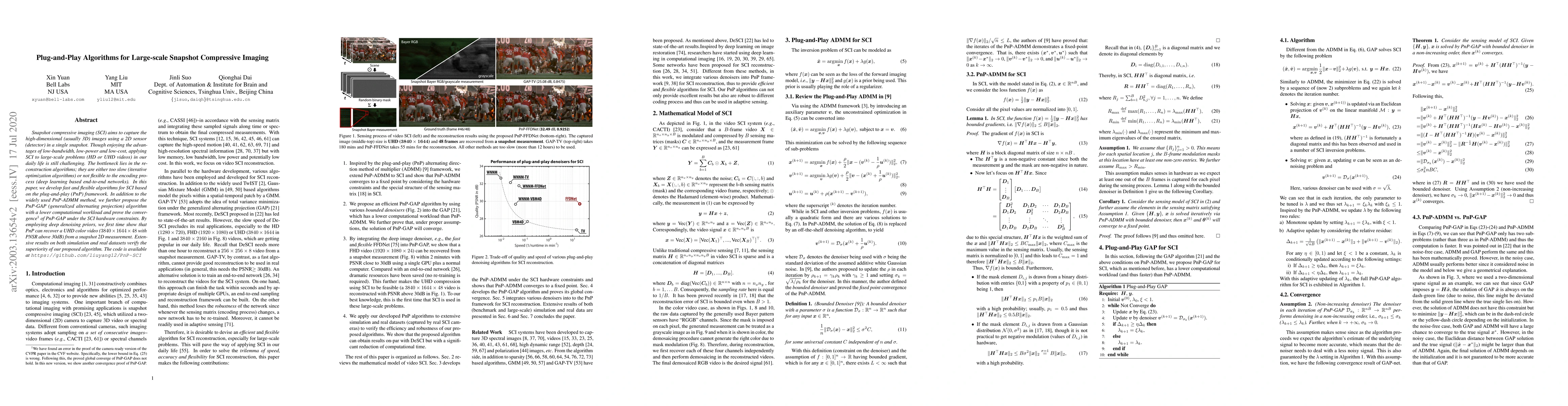 This paper develops fast and flexible plug-and-play (PnP) algorithms for snapshot compressive imaging (SCI) to reconstruct large-scale 3D images from a single 2D snapshot. The proposed PnP-GAP algorithm offers lower computational costs and proves convergence under SCI constraints, enabling UHD video reconstruction from a single measurement.