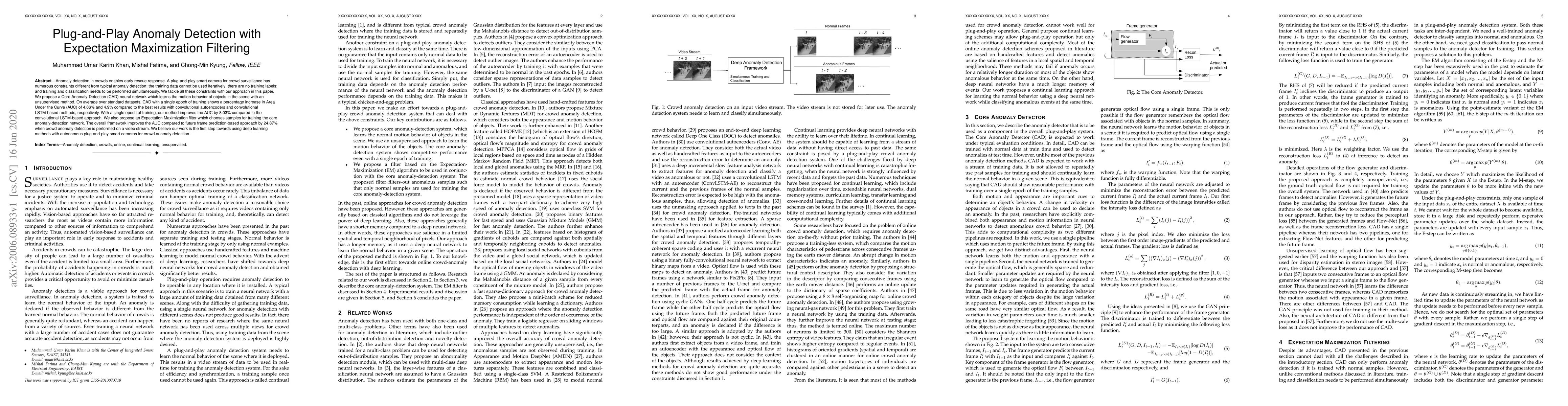 This paper presents a plug-and-play anomaly detection system for crowd surveillance using a Core Anomaly-Detection neural network and an Expectation Maximization filter, achieving significant improvements in detection accuracy over existing methods. The proposed approach demonstrates a substantial increase in Area Under the Curve (AUC) performance, especially with minimal training.