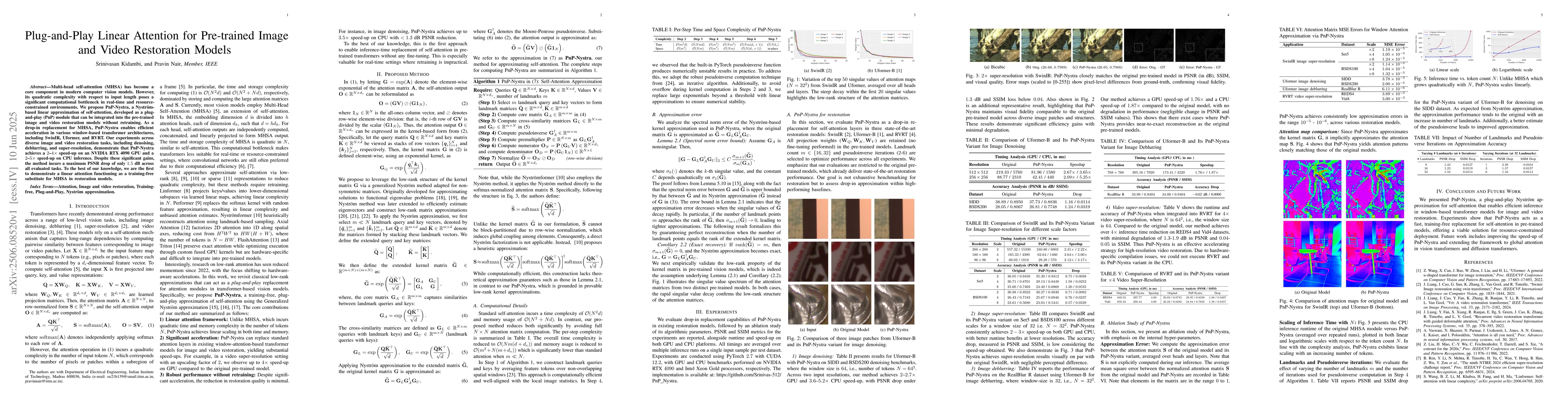 This research introduces PnP-Nystra, a linear attention approximation of multi-head self-attention (MHSA) for real-time image and video restoration models. It functions as a plug-and-play module, replacing MHSA without retraining, achieving 2-4x speed-up on GPU and 2-5x on CPU with minimal PSNR drop.
