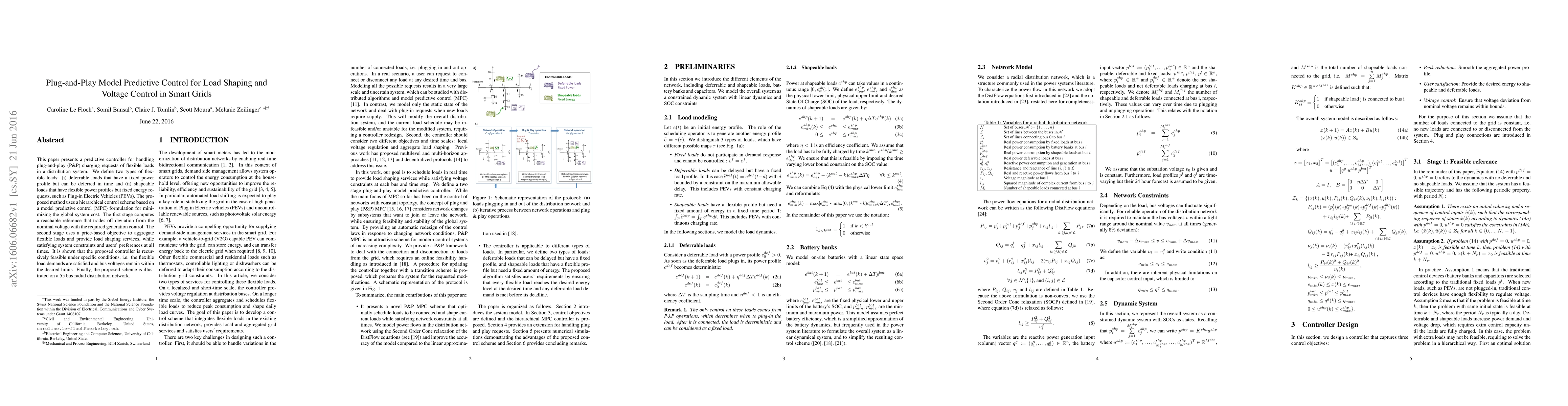 This paper introduces a plug-and-play model predictive control method for managing flexible load charging requests in smart grids, focusing on deferrable and shapeable loads. The hierarchical MPC scheme minimizes system costs while ensuring voltage control and user preferences.