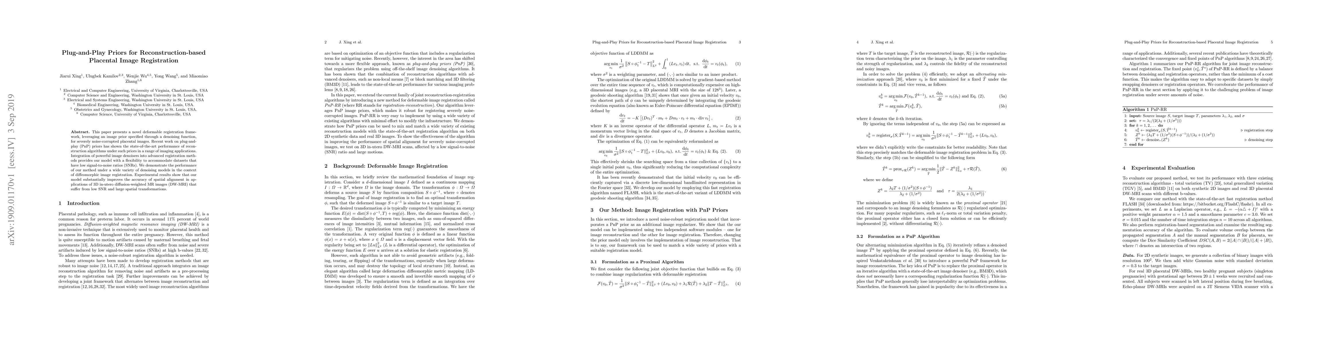 This paper introduces a novel deformable registration framework using plug-and-play priors and denoising functions to enhance the registration of severely noise-corrupted placental images, significantly improving accuracy in low SNR 3D in-utero diffusion-weighted MR images.