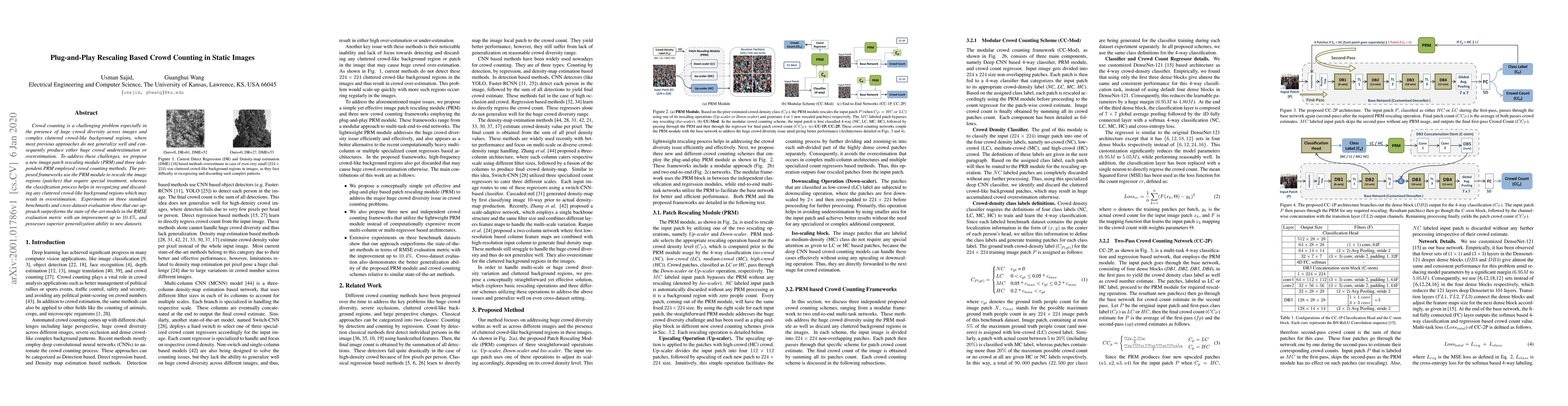 The paper proposes a new image patch rescaling module (PRM) to enhance crowd counting in static images, addressing the issue of crowd diversity and cluttered backgrounds. The PRM module rescales image regions for better treatment, while a classification process discards background regions to avoid overestimation, leading to superior performance and generalization across datasets.