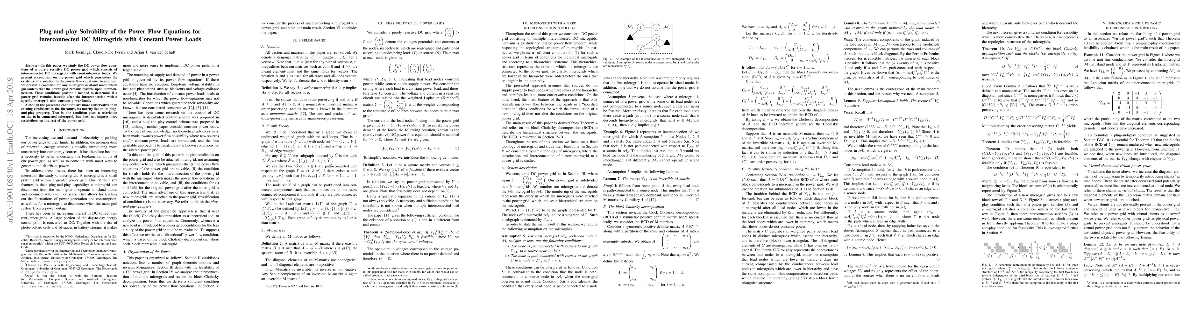 In this paper we study the DC power flow equations of a purely resistive DC power grid which consists of interconnected DC microgrids with constant-power loads. We present a condition on the power grid which guarantees the existence of a solution to the power flow equations. In addition, we present a condition for any microgrid in island mode which guarantees that the power grid remains feasible upon interconnection. These conditions provide a method to determine if a power grid remains feasible after the interconnection with a specific microgrid with constant-power loads. Although the presented condition are more conservative than existing conditions in the literature, its novelty lies in its plug-and-play property. That is, the condition gives a restriction on the to-be-connected microgrid, but does not impose more restrictions on the rest of the power grid.