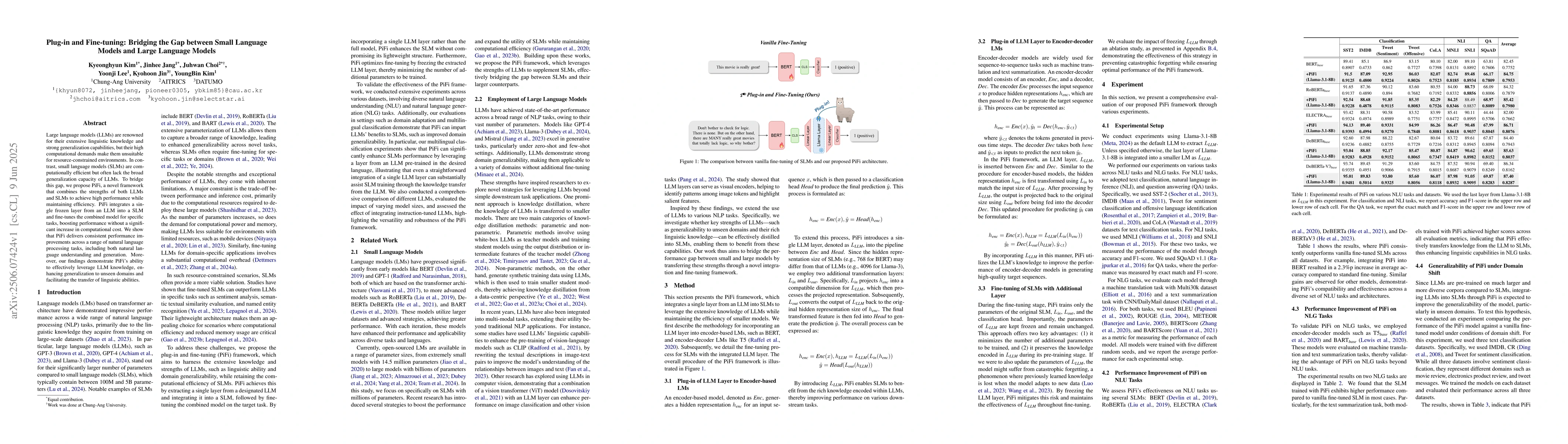 A new framework called PiFi improves performance of small language models by combining a frozen layer from large language models with fine-tuning for specific tasks, achieving consistent gains in natural language processing tasks.