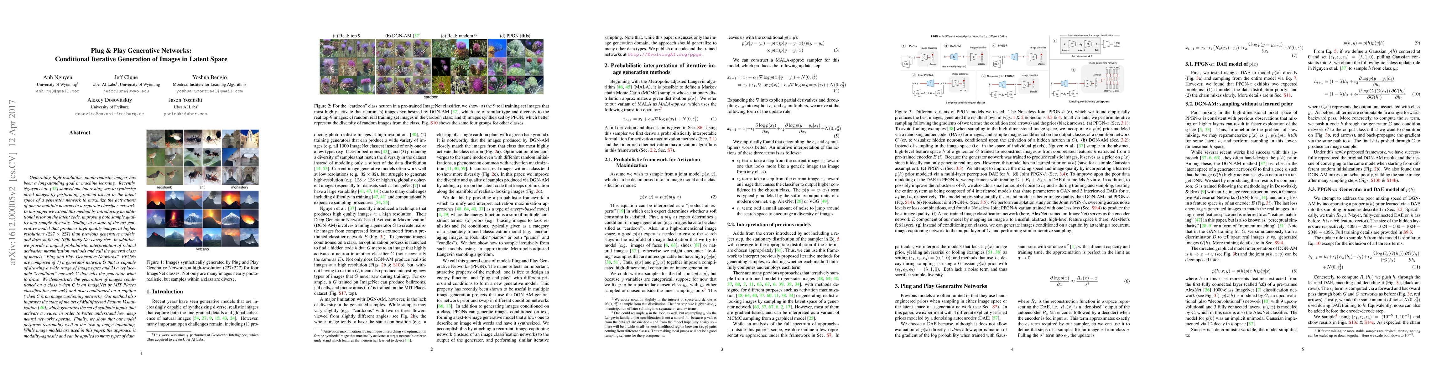 This paper introduces Plug & Play Generative Networks, a method that generates high-quality images at higher resolutions than previous models, with applications in image classification, captioning, and feature visualization, and shows improved sample quality and diversity.
