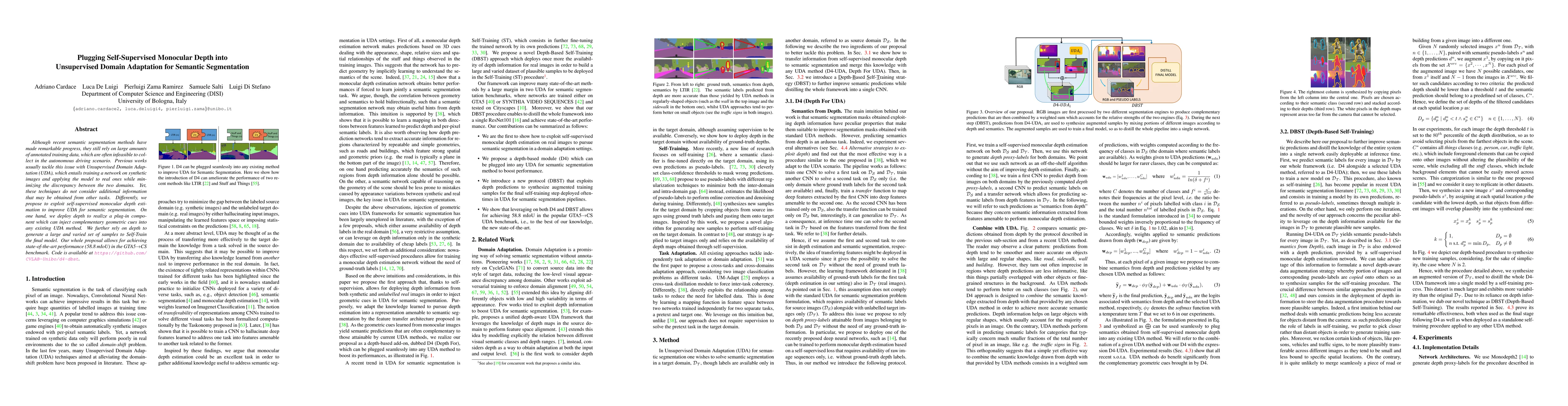Although recent semantic segmentation methods have made remarkable progress, they still rely on large amounts of annotated training data, which are often infeasible to collect in the autonomous driving scenario. Previous works usually tackle this issue with Unsupervised Domain Adaptation (UDA), which entails training a network on synthetic images and applying the model to real ones while minimizing the discrepancy between the two domains. Yet, these techniques do not consider additional information that may be obtained from other tasks. Differently, we propose to exploit self-supervised monocular depth estimation to improve UDA for semantic segmentation. On one hand, we deploy depth to realize a plug-in component which can inject complementary geometric cues into any existing UDA method. We further rely on depth to generate a large and varied set of samples to Self-Train the final model. Our whole proposal allows for achieving state-of-the-art performance (58.8 mIoU) in the GTA5->CS benchmark benchmark. Code is available at https://github.com/CVLAB-Unibo/d4-dbst.