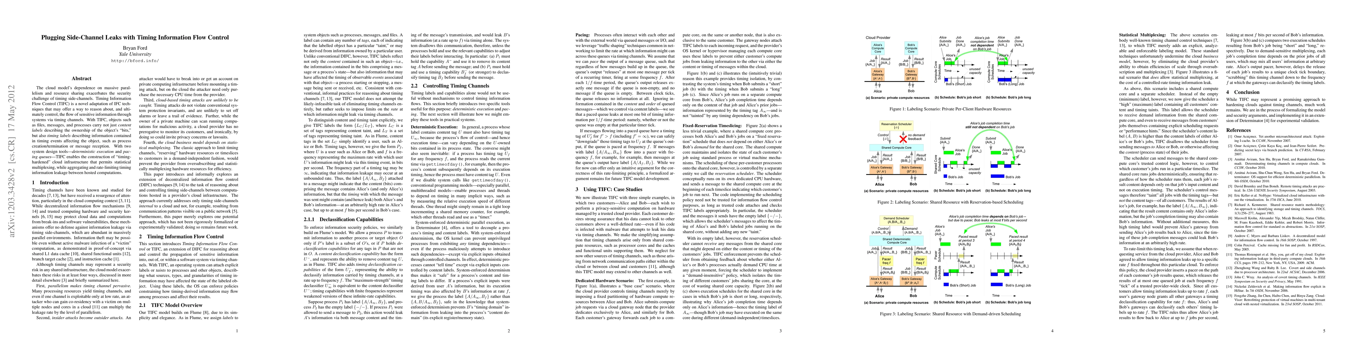 This paper proposes Timing Information Flow Control (TIFC) as a method to mitigate timing side-channel leaks in cloud computing environments by incorporating timing labels alongside content labels for files, messages, and processes. TIFC leverages deterministic execution and pacing queues to create "timing-hardened" infrastructure, controlling timing information leakage while allowing statistical multiplexing.