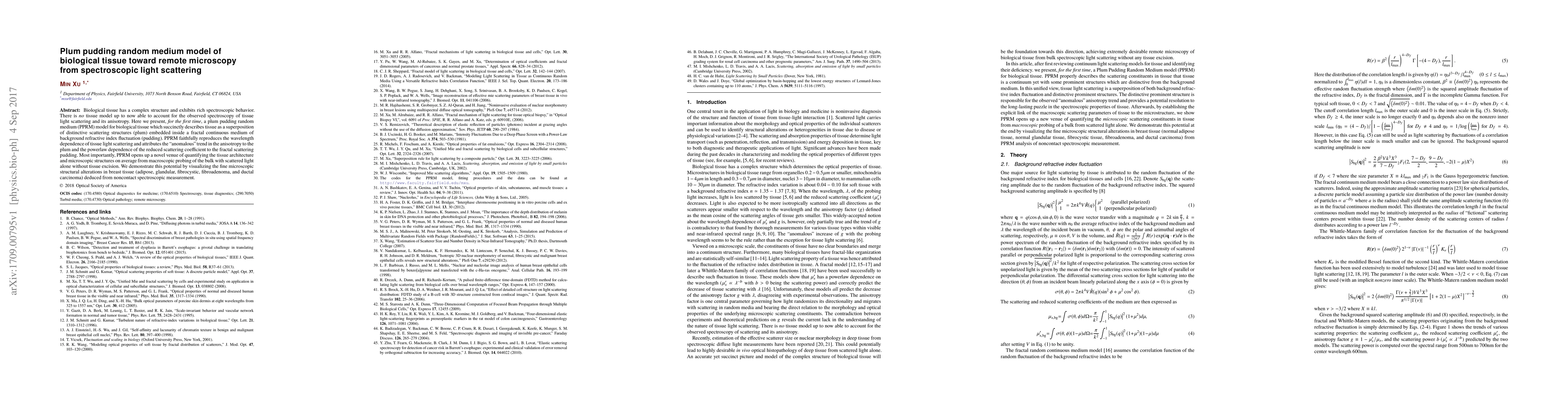 Biological tissue has a complex structure and exhibits rich spectroscopic behavior. There is \emph{no} tissue model up to now able to account for the observed spectroscopy of tissue light scattering and its anisotropy. Here we present, \emph{for the first time}, a plum pudding random medium (PPRM) model for biological tissue which succinctly describes tissue as a superposition of distinctive scattering structures (plum) embedded inside a fractal continuous medium of background refractive index fluctuation (pudding). PPRM faithfully reproduces the wavelength dependence of tissue light scattering and attributes the "anomalous" trend in the anisotropy to the plum and the powerlaw dependence of the reduced scattering coefficient to the fractal scattering pudding. Most importantly, PPRM opens up a novel venue of quantifying the tissue architecture and microscopic structures on average from macroscopic probing of the bulk with scattered light alone without tissue excision. We demonstrate this potential by visualizing the fine microscopic structural alterations in breast tissue (adipose, glandular, fibrocystic, fibroadenoma, and ductal carcinoma) deduced from noncontact spectroscopic measurement.