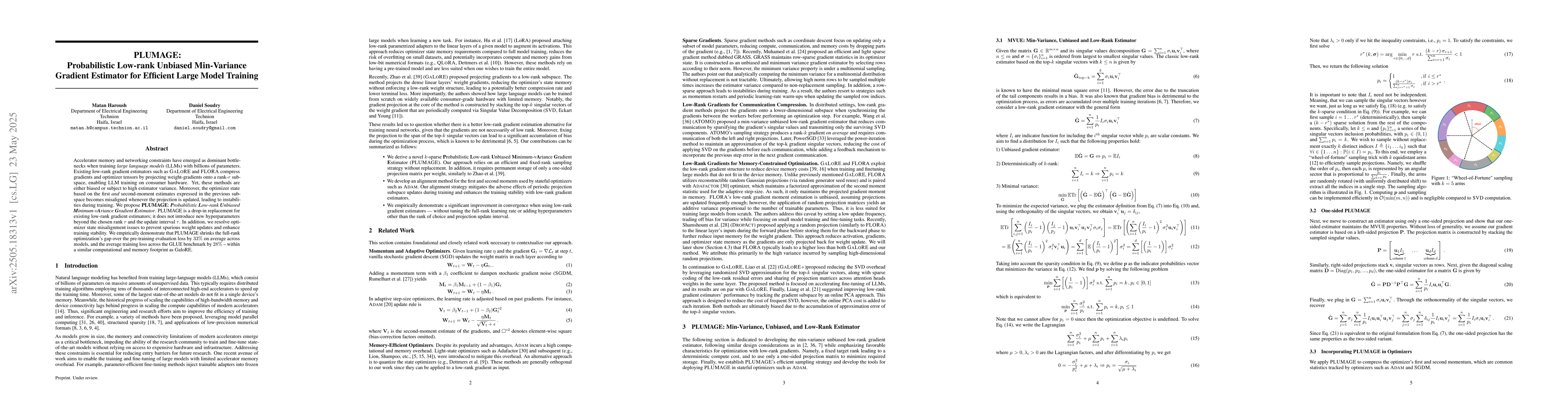 The paper proposes PLUMAGE, a probabilistic low rank unbiased minimum variance gradient estimator to address memory and networking constraints in training large language models. It aims to replace existing low rank gradient estimators like GaLoRE and FLORA, resolving their biased or high variance issues, and optimizer state misalignment problems.