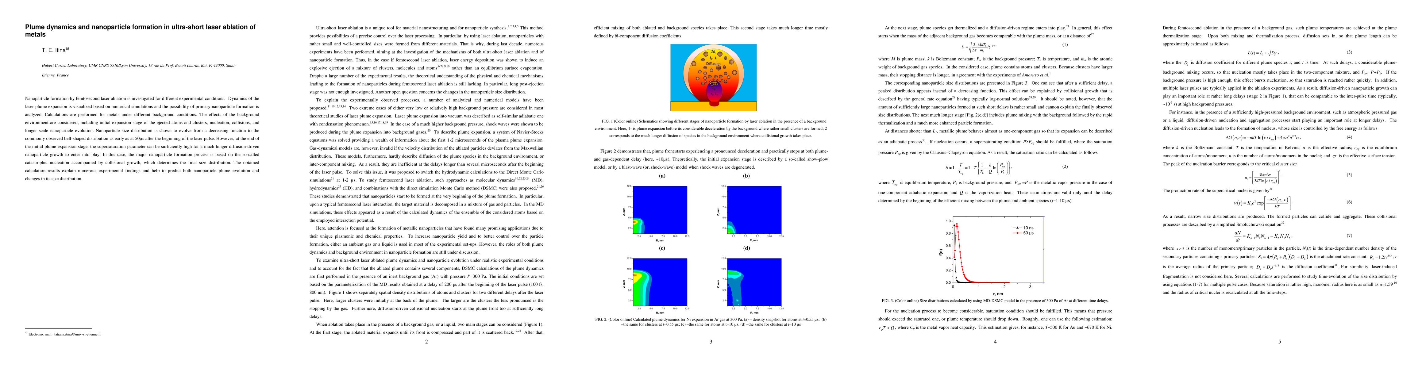 Nanoparticle formation by femtosecond laser ablation is investigated for different experimental conditions. Dynamics of the laser plume expansion is visualized based on numerical simulations and the possibility of primary nanoparticle formation is analyzed. Calculations are performed for metals under different background conditions. The effects of the background environment are considered, including initial expansion stage of the ejected atoms and clusters, nucleation, collisions, and longer scale nanoparticle evolution. Nanoparticle size distribution is shown to evolve from a decreasing function to the commonly observed bell-shaped distribution as early as at 50 microseconds after the beginning of the laser pulse. However, at the end of the initial plume expansion stage, the supersaturation parameter can be sufficiently high for a much longer diffusion-driven nanoparticle growth to enter into play. In this case, the major nanoparticle formation process is based on the so-called catastrophic nucleation accompanied by collisional growth, which determines the final size distribution. The obtained calculation results explain numerous experimental findings and help to predict both nanoparticle plume evolution and changes in its size distribution.