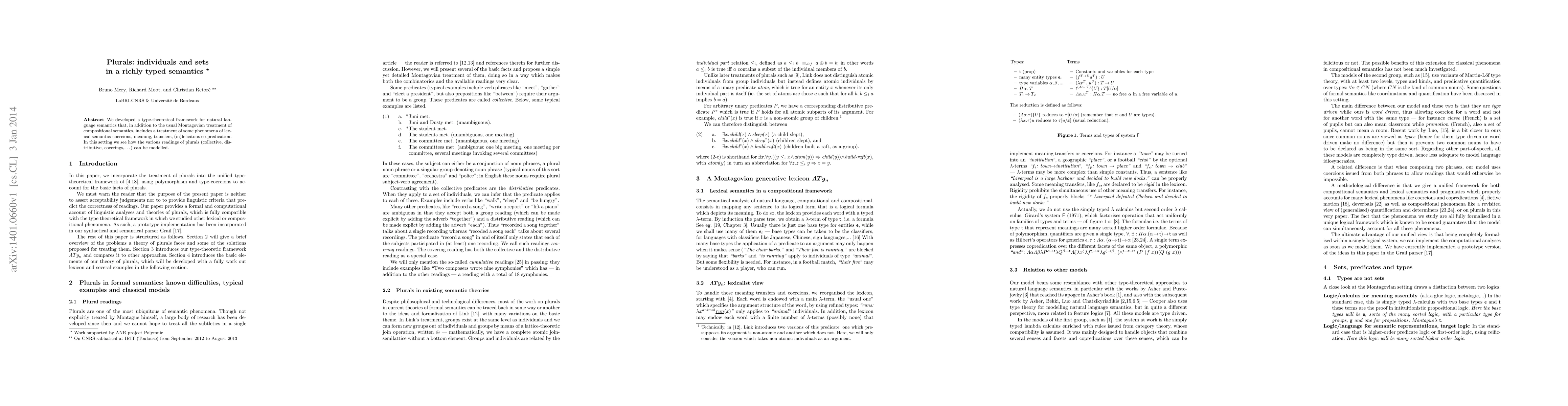 We developed a type-theoretical framework for natural lan- guage semantics that, in addition to the usual Montagovian treatment of compositional semantics, includes a treatment of some phenomena of lex- ical semantic: coercions, meaning, transfers, (in)felicitous co-predication. In this setting we see how the various readings of plurals (collective, dis- tributive, coverings,...) can be modelled.