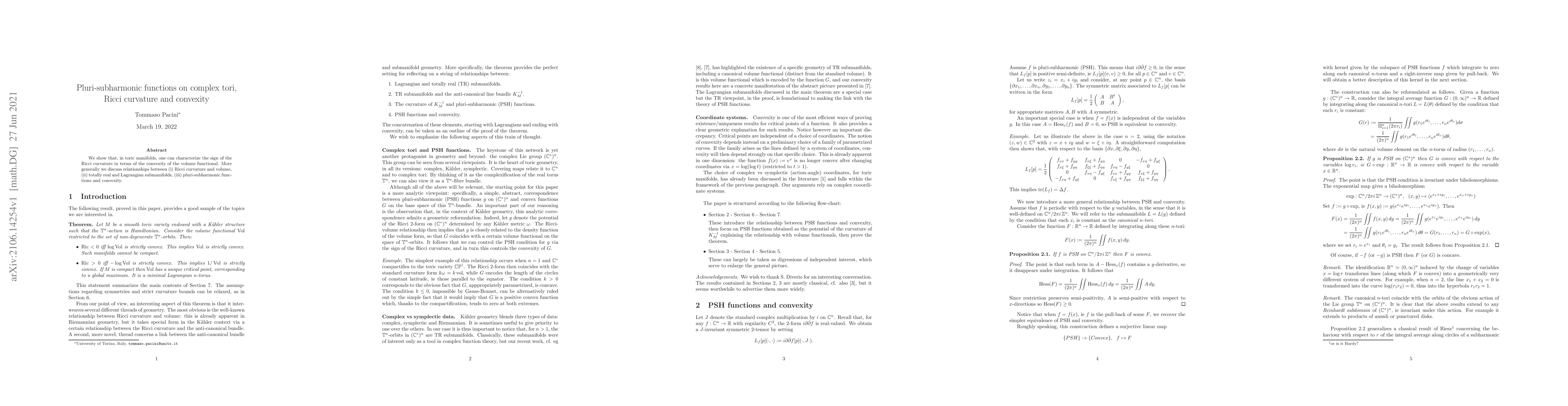 Summary: This paper demonstrates that Ricci curvature in toric manifolds can be characterized by the convexity of the volume functional. It also explores connections between Ricci curvature, volume, submanifolds, and pluri-subharmonic functions.