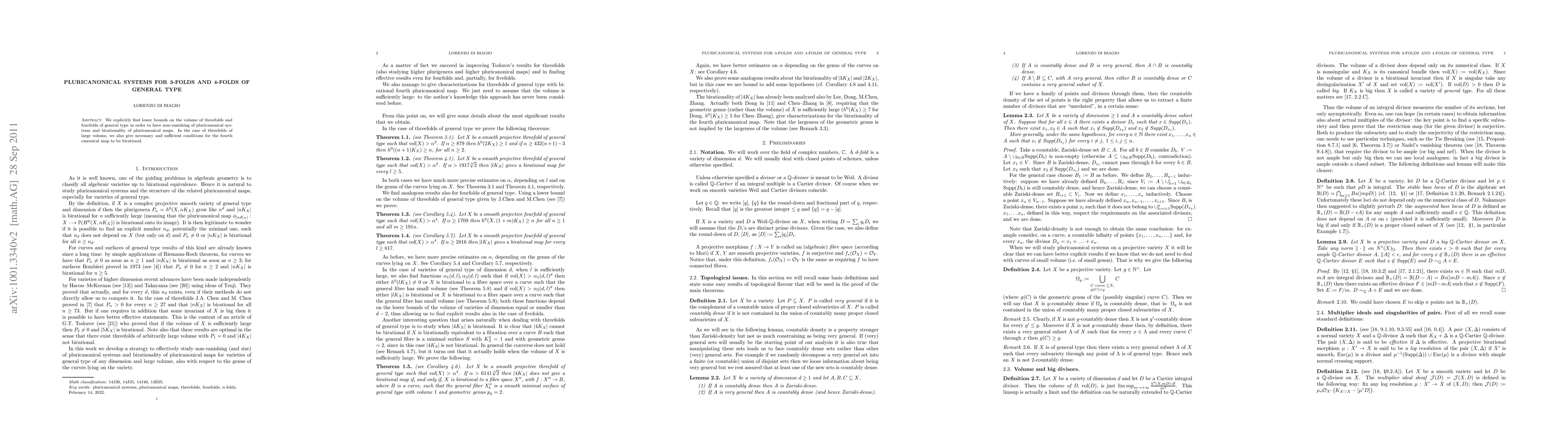 Researchers found lower bounds on the volume of 3-folds and 4-folds to ensure nonvanishing pluricanonical systems and birationality of maps, with specific conditions for higher-dimensional cases.